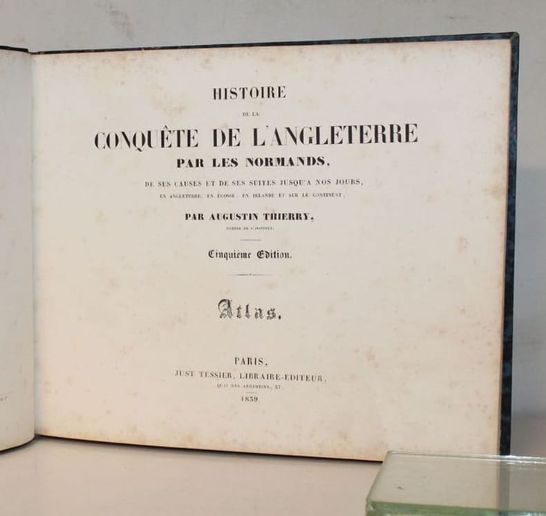 Bon ex. Bien complet des 14 planches (cartes, relevé détaillé de la Tapisserie de Bayeux, Charte de la Fondation de Saint Martin de la Bataille AD 1087, sceaux, monnaies et armes. L' Atlas seul : 200 ENB : nous disposons par ailleurs des Oeuvres complètes d'Augustin Thierry, en 5 volumes brochés, Chez Furne, Paris ( dont L'Histoire de la Conquête de l'Angleterre par les Normands (2 vol.). Les 5 vol. de textes : 100 E
