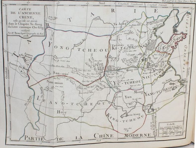 L'ouvrage au complet doit comporter 13 volumes (3 cartes, 5 tableaux, 16 planches) et un atlas in-folio de 65 planches. Célèbre missionaire français, le père Mailla obtint en 1701 de faire partie de la mission de Chine. En 1703 il débarqua à Macao, et se rendit ensuite à Canton où en peu de temps il acquit une parfaite connaissance de la langue et de l'écriture de ce pays. L'empereur Khan-Hi qui avait une haute estime des jésuites, le chargea en 1708 de lever une carte générale de la Chine et de la tartarie. Le père Mailla s'acquitta fort bien de cette tâche et fut élevé, en récompense, au titre de mandarin. Résidant à la cour, il y commença l'étude du mandchou et passa plusieurs années à traduire le Thoun-Kiang Kang-Mou, grande chronique chinoise rédigée en mandchoue. Son manuscrit fut envoyé en France en 1737 à Fréret, et l'abbé Grosier se chargea de le publier sous le titre d'Histoire générale de la Chine. Les 6 premiers volumes présents ici traitent de L'an 2953 à l'an 888 avant J.C. Cordier Sinica 363.