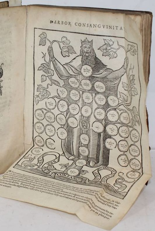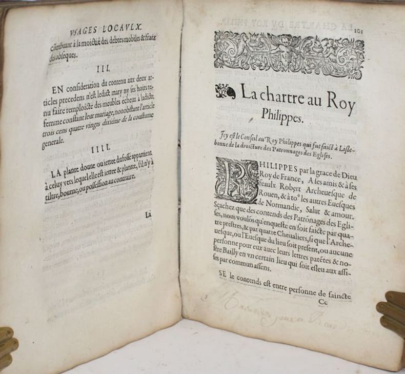 1586 1 À Paris, pour Thomas Mallard marchand libraire demeurant à Rouën, 1586, in-4° de 10 ff.n.ch. (2 bl., titre "aux léopards", 7 ff. d'Epistre) - 120 ff. chiffrés - un arbre de consanguinité replié (non mentionné par Frère) - 43 ff. de Procès-verbal - 2 ff.n.ch. (table, feuillet de la marque "aux léopards" du libraire Martin Le Mégissier) ; reliure de vélin souple à recouvrement d'époque, dos lisse, lacets postérieurs ; manque angulaire de vélin au second plat, coins inférieurs de la page de titre et des 4 premiers feuillets restaurés, de même les cinq derniers feuillets restaurés, quelques traces de mouillure marginales.