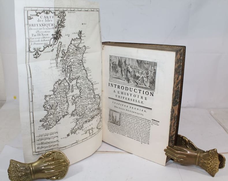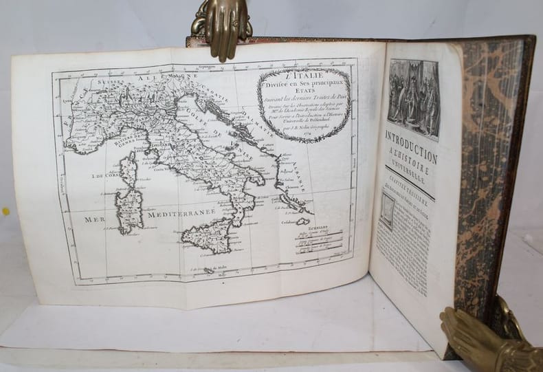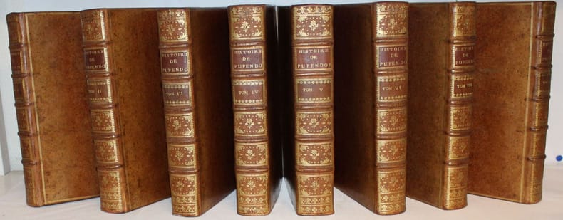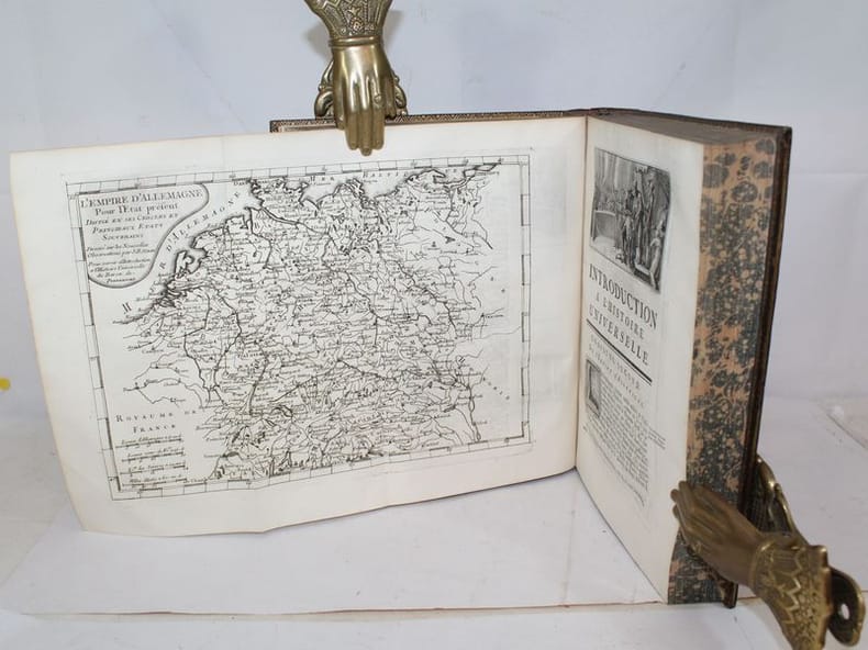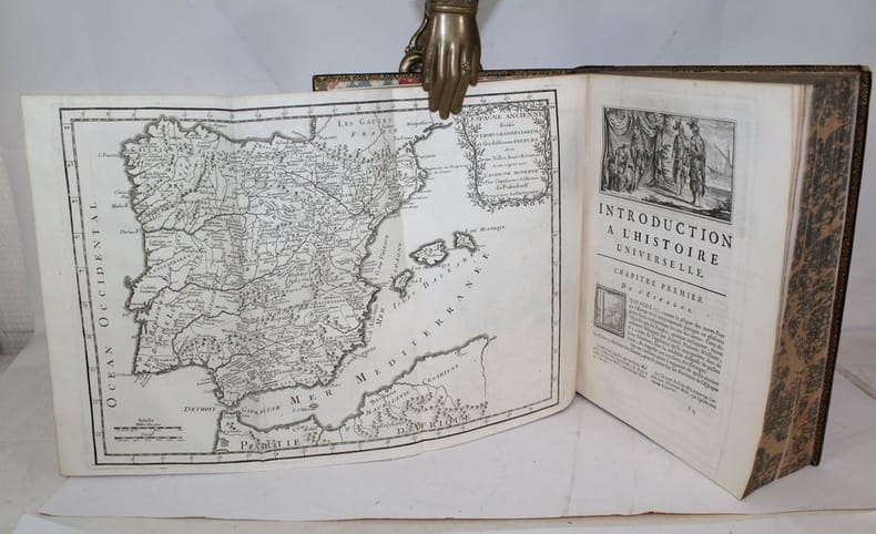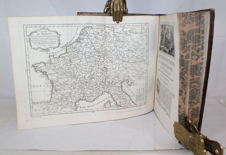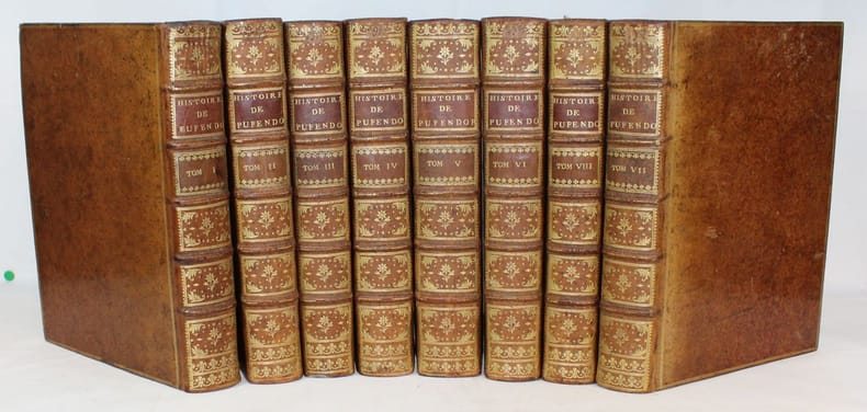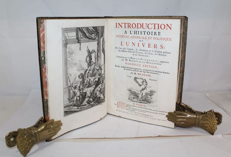 Nouvelle édition, commencée par le Baron de Pufendorff, augmentée par M. Bruzen de La Martinière, Revûe, considérablement augmentée, corrigée sur les meilleurs Auteurs, & continuée jusqu'en 1750 par M. De Grace. Samuel von Pufendorf, né en 1632 à Dorfchemnitz en Saxe, mort en 1694 (à 62 ans) à Berlin, est un historien, juriste et philosophe allemand, représentant du droit naturel moderne ou protestant. Antoine-Augustin Bruzen de La Martinière, né à Dieppe en 1662 et mort à La Haye en 1746, est un historien et compilateur français. La Martinière fit ses études à Paris, sous la direction de son grand-oncle l'exégète Richard Simon, qui lui inspira le goût des études historiques et géographiques. Grâce aux munificences de ses mécènes, il vécut à la cour du duc Frédéric-Guillaume de Mecklembourg-Schwerin, puis à celle de François Farnèse, duc de Parme et de Plaisance. Il fut aussi employé par le roi Philippe V d'Espagne et le royaume des Deux-Siciles. Thomas-François de Grace, né en 1713 à Paris et mort le 28 novembre 1798 à Paris, est un économiste et un agronome français. Thomas-François de Garce est le fils dun capitaine au régiment irlandais de Clare, et il sert quelque temps dans le même corps. Nayant aucun goût pour létat militaire, il donne sa démission, vient sétablir à Paris, et y ouvre une école particulière, où il enseigne presque toute sa vie. Lhistorien et linguiste Nicolas Fréret (1688-1749) lui fait obtenir la place de sous-secrétaire de lAcadémie des Inscriptions. Après avoir rempli ses devoirs, il partage ses loisirs entre létude et la culture des fleurs. La révolution trouble sa tranquillité ; elle le prive de sa place au moment où il allait obtenir la pension de retraite, prix de 44 années dassiduité et de zèle dans lexercice de ses fonctions. Les membres de lacadémie viennent dabord à son secours, mais, à lépoque de leur dispersion, il tombe dans lindigence. Il perd la vue dans le même temps, et aurait succombé si le ministre de lIntérieur, instruit de sa position, ne lui eût fait payer une gratification annuelle, à titre dancien censeur. Très bel exemplaire en veau d'époque, complet de ses cartes, provenant de la riche collection appartenant à la famille Le Caron de Troussures, avec ex-libris gravé. (Beauvais). La seigneurie de Troussures, telle quelle apparaît à la fin du XVIIIe siècle, est issue de la réunion, par la famille Le Caron, de fiefs ayant appartenu à plusieurs familles (famille Richard, famille de Mouchy).