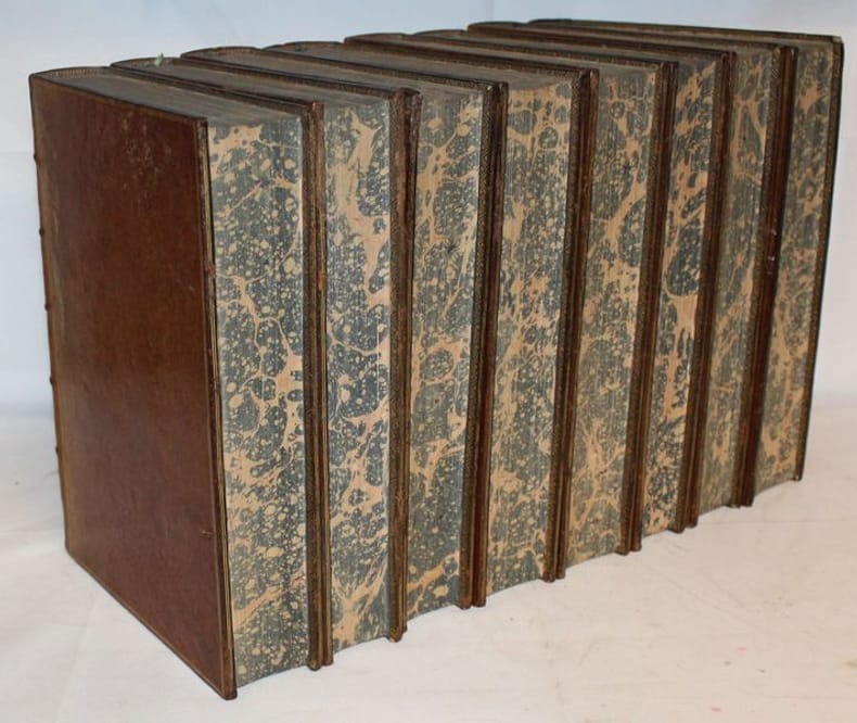 Paris, Merigot, Grange, Hochereau, Robustel, 1753 - 1758. Huit volumes in-4. Beau frontispice gravé, nombreuses vignettes, fleurons et culs-de-lampe avec leur explication à chaque volume. 26 belles cartes dépliantes et 2 tableaux. Intérieur très frais. Plein veau havane granité, triple filet doré sur les plats, dos à nerfs ornés de fleurons dorés, pièces de titre et de tomaison de maroquin havane, tranches marbrées. Minime accroc à une coiffe et un coin. Reliure de l'époque