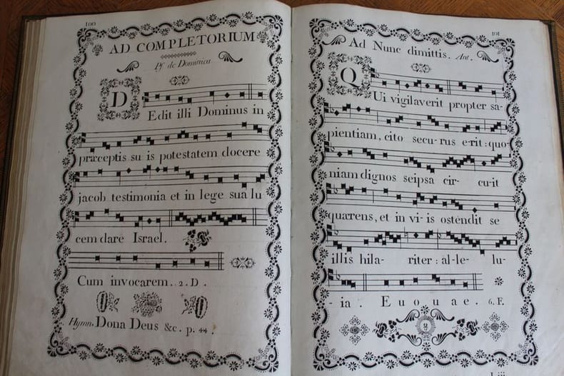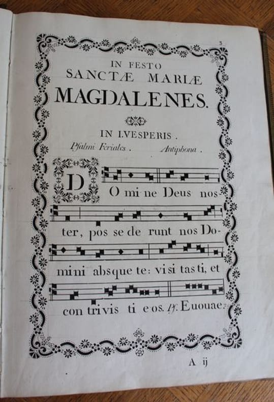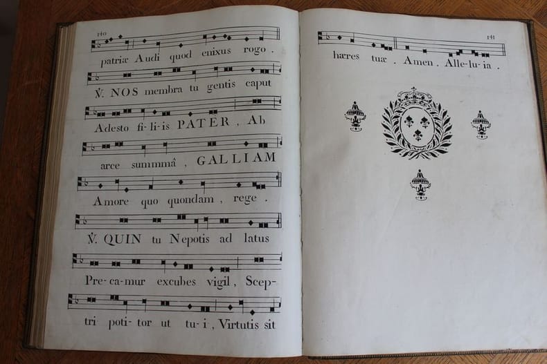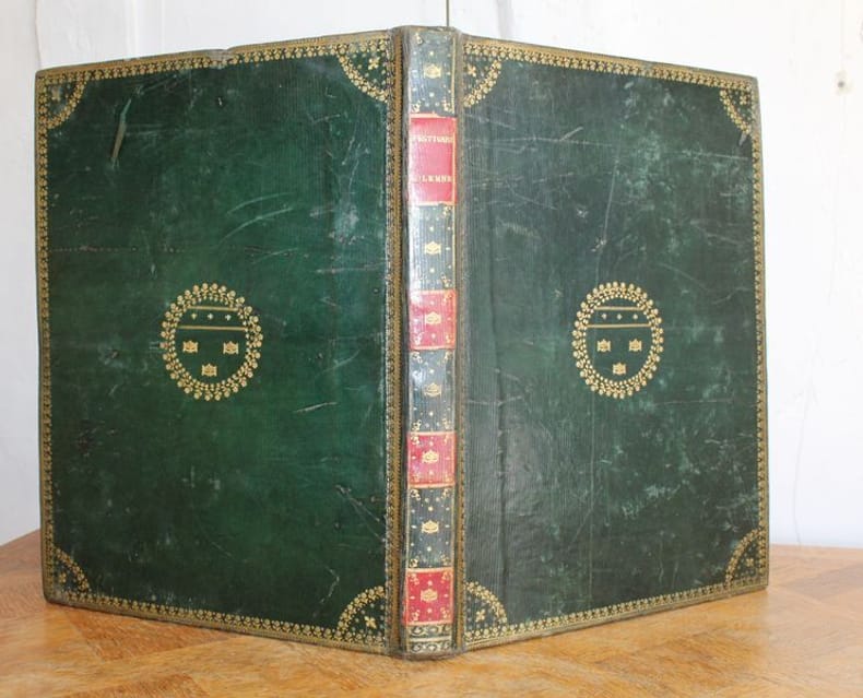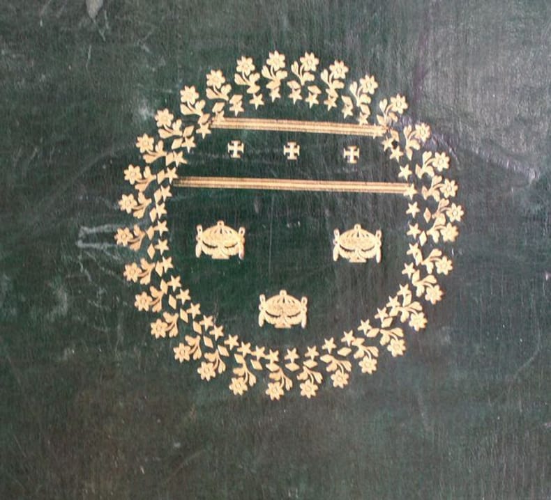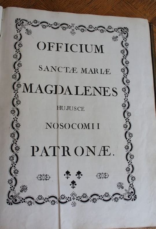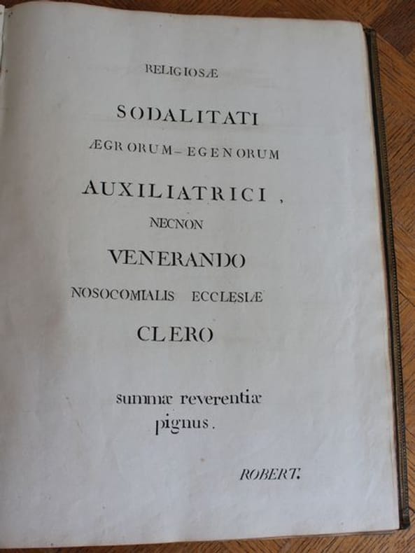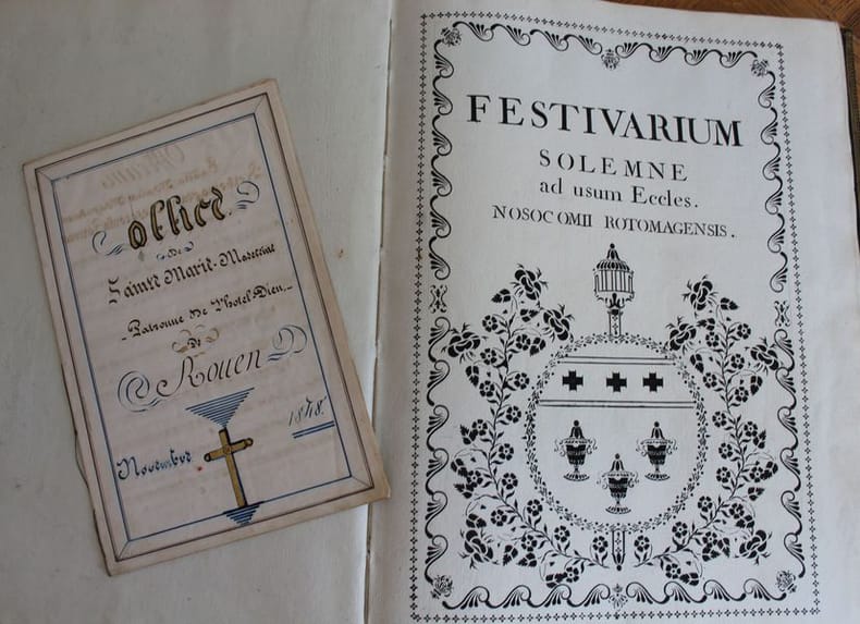 Sans date (XIX ème siècle), signé Robert à la fin de la dédicace en latin: à la Société de Secours aux Malades Nécessiteux, ainsi qu'au vénérable clergé de l'église hospitalière. In-folio (56 x 42 cm) de 141 pages sur papier vergé épais, entièrement calligraphié. Titre illustré des armes de l'Hôtel-Dieu de Rouen (d'azur, à trois boîtes d'or, au chef d'argent, chargé de trois croix de gueules). Joint: Office de Ste Marie-Madeleine, Patronne de l'Hôtel-Dieu de Rouen, novembre 1848. Manuscrit in-folio de 10 ff. Avec partitions et chants. Maroquin vert, roulette dorée d'encadrement et dans les angles, armes au centre, dos lisse orné des pots en alternance sur des pièces de maroquin rouge, roulette intérieure. Très bon état.