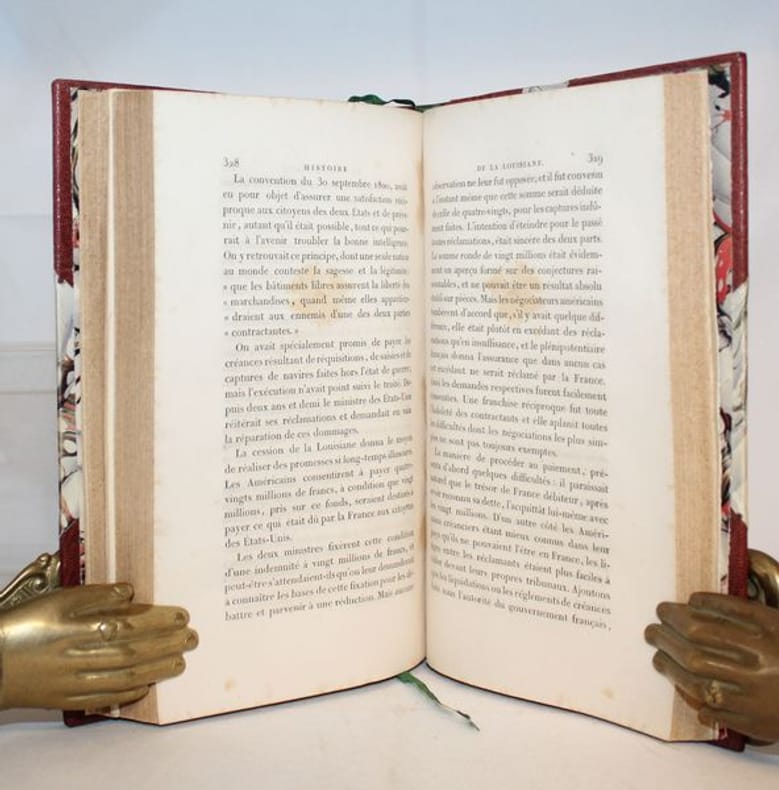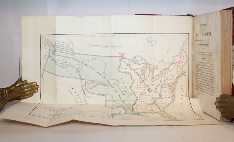 Avec la Carte Générale des Etats-Unis pour servir à l'Histoire de la Louisiane 1829, dépliante relative à l'étendue des Pays cedés avec les limites en couleurs d'époque et un portrait de l'auteur en frontispice. Paris, Firmin Didot, 1829. In-8 (22x3,5x13cm) relié plein cartonnage vert d'époque, dos à faux nerfs dorés et titre doré. 2ff de notes au Dauphin + 285pp. Quelques mouillures transparentes dans toutes marges de l'ensemble du livre.