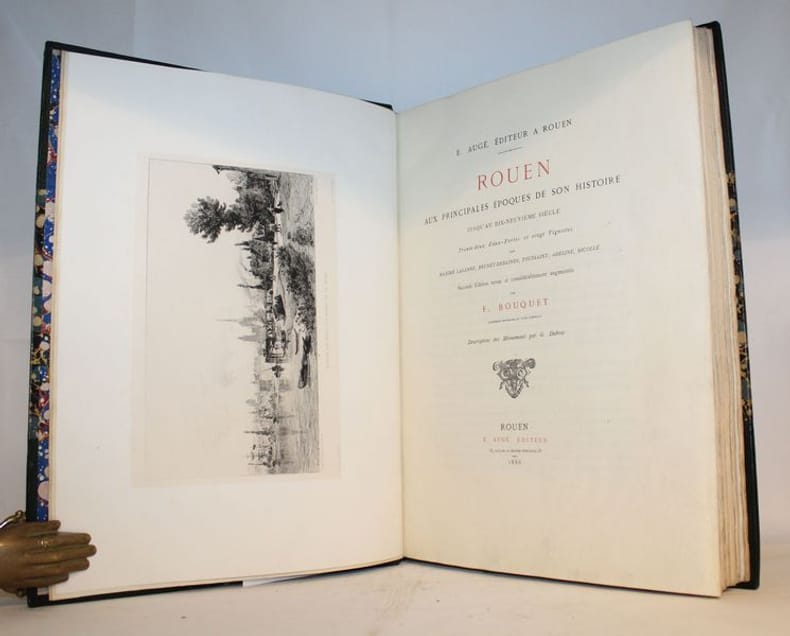 Rouen, Augé, 1886. Très grand in-4 de 143 pages. 32 eaux-fortes et 20 vignettes par Lalanne, Brunet-Debaines, Toussaint, Adeline , Nicolle (rousseurs marginales). Seconde édition revue et considérablement augmentée. Edition de luxe avec les eaux-fortes sur Chine monté. Faux-titre, page de titre en rouge et noir. Les planches sont précédées dune serpente portant la description détaillée de chaque monument par G. Dubosc. Demi-chagrin à coins bleu, tête dorée, dos à nerfs orné, filet doré (Petitbled à Rouen), dos passé.
