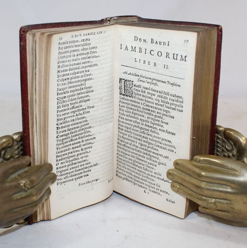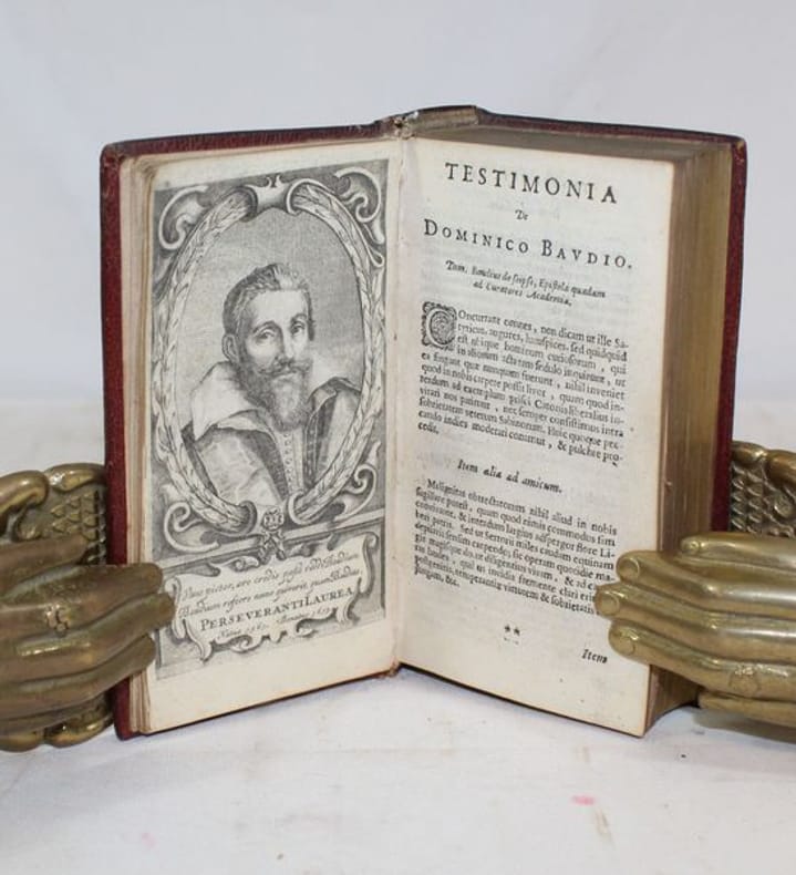 Dominicus Baudius (Dominique Baudier, Lille 1564-1613) était issu dune famille protestante. Les rigueurs du duc dAlbe lavaient forcé de se réfugier à Aix-la-Chapelle. Il acheva ses études à Genève où il reçut les leçons de Théodore de Bèze, prit le grade de docteur en droit en 1585, fit partie, la même année de lambassade envoyée à la reine Élisabeth ire dAngleterre par les états généraux ; et après avoir été quelque temps avocat à La Haye, il partit pour Paris où il resta dix ans. Il sy lia avec les hommes les plus éminents du temps, Sully-Mornay, de Thou, du Harlay dont lamitié lui permit de devenir avocat au Parlement de Paris. Établi à Leyde vers 1602, il y fut nommé successivement professeur déloquence et dhistoire, et historiographe des états généraux conjointement avec Meursius . Doué dune brillante imagination, possédant une érudition prodigieuse, à la fois éloquent et passionné, Baudius gâta ses belles qualités par les désordres de sa vie privée, par son amour désordonné du vin et des femmes et mourut dans la misère. Baudius a laissé des poèmes latins et quelques traités de droit et dhistoire flamande. Son renom littéraire a surtout tenu à ses épîtres. Publiées pour la première fois en 1615, elles ont été réimprimées et complétées jusquen 1662. La dernière édition alors disponible était Epistolarum centuriæ tres, lacunis aliquot suppletis, accedunt eiusdem Orationes [Trois centuries dépîtres, où on a comblé certaines lacunes et ajouté ses Discours] (Amsterdam, Jan Jansson, 1647, in-12).
