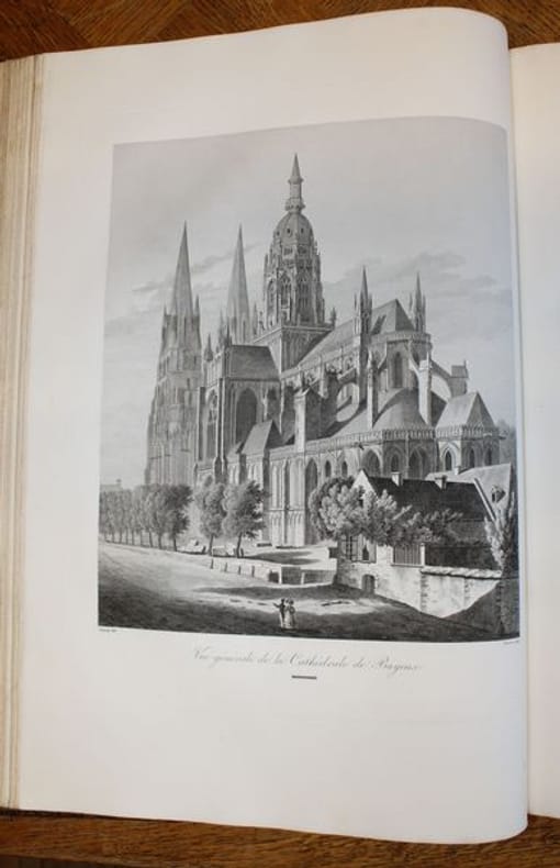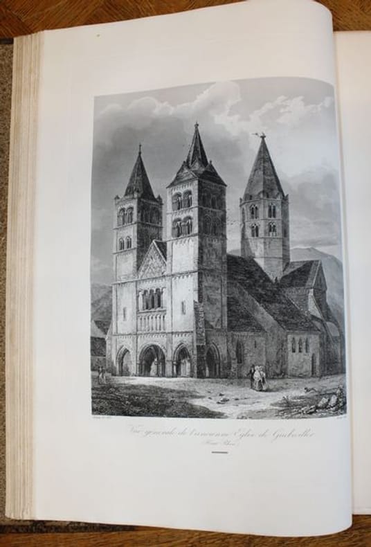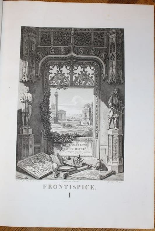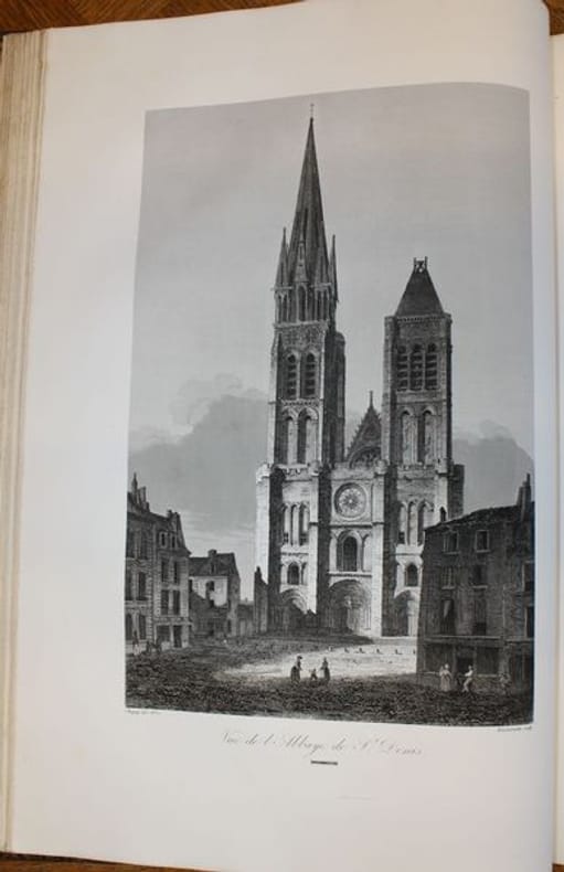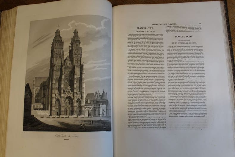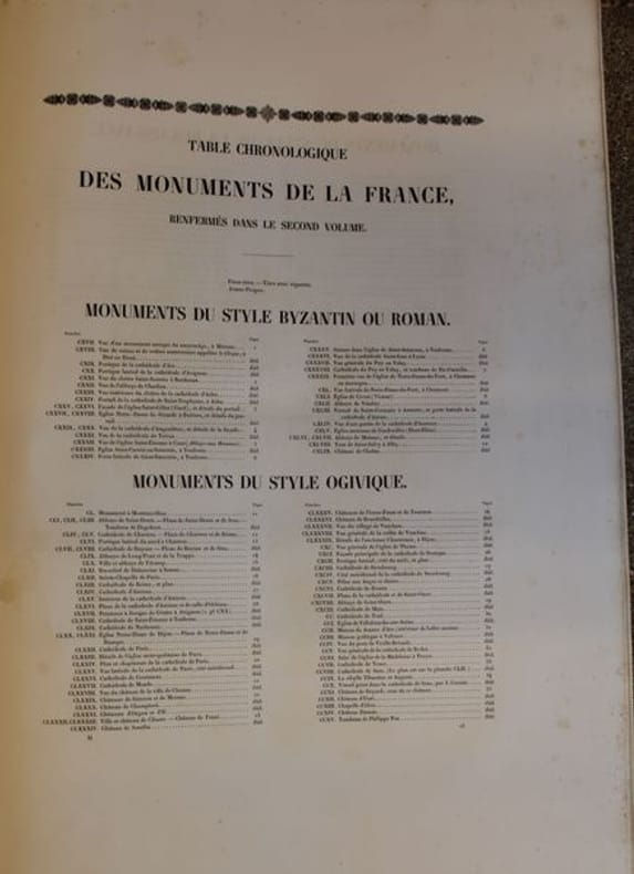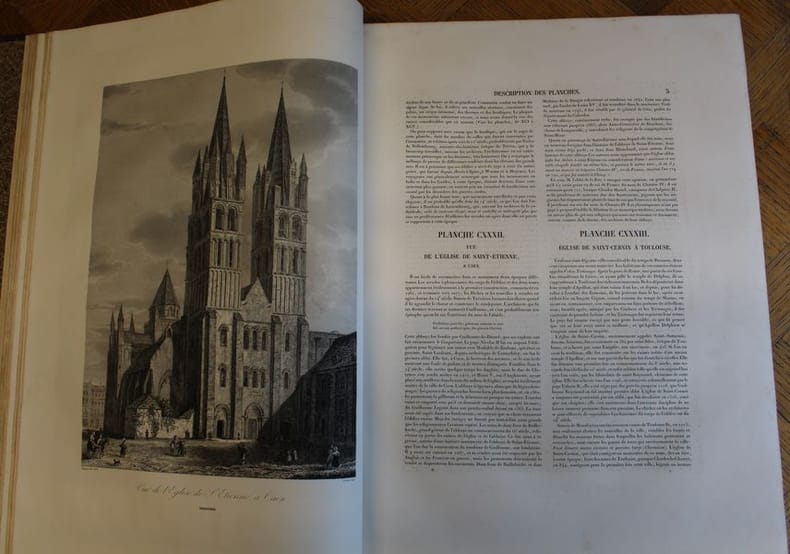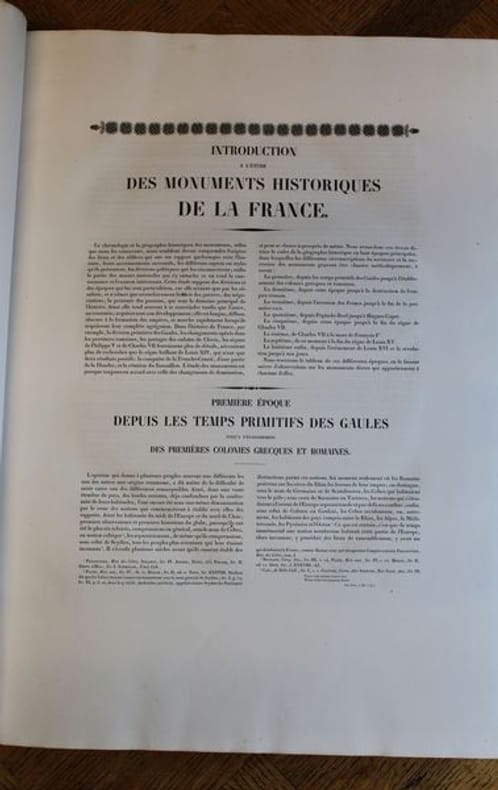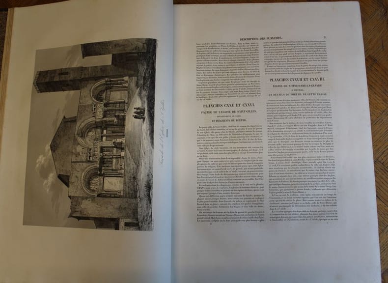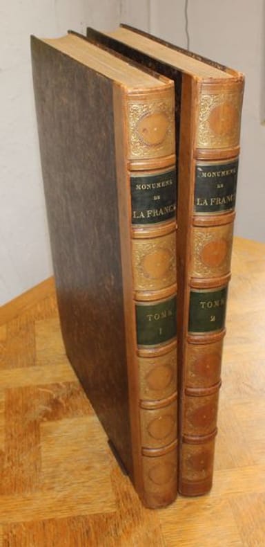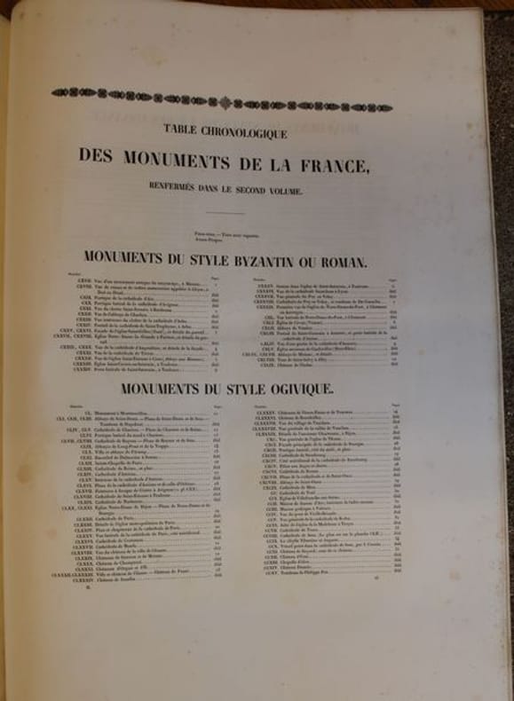 Rare édition originale magnifiquement illustrée. L'illustration se compose d'un frontispice et de 259 planches hors texte, dont 23 à double page, contenant plus de 300 sujets, lithographiées par Baltard, Réville, Malbeste, d'après les dessins de Constant Bourgeois, Nicolas Chapuy et Bance, qui avaient consacré plusieurs années à parcourir la France et qui devinrent, après 1820, les artisans des grands recueils lithographiques. «L'héritage de tous les siècles» se trouve ici rassemblé, l'auteur voulant montrer que la France est, de toutes les contrées, la plus riche en monuments de tous les âges. Tiré de l'avant propos " Dans le premier volume, nous avons décrit la plus grande partie des monuments celtiques et romains... Second volume doit contenir la description des édifices civils et religieux élevés sous le règne de nos Rois...Nous y avons signalés trois genres d'architecture.. Style roman ou à plein-cintre, appelé indistinctment saxon ou lombard ; le style ogivique, dit improprment gothique ou arabesque, et le style de la renaissance". Précieuse édition de cet important ouvrage illustrant de la plus belle des manières les monuments des villes de Sens, Joigny, Vézelay, Cavaillon, Vienne, Fréjus, Aix, Reims, Avignon, Bordeaux, Toulouse, Autun, Toul, Lyon, Chartres, Paris, Tours (la planche 184 se trouve sur la planche 180) Vicaire IV, 749 ; Brunet III, 714.