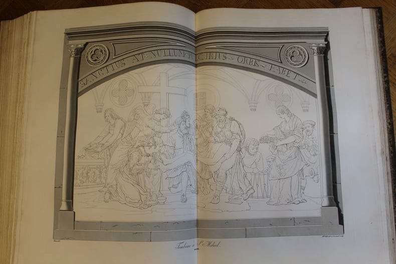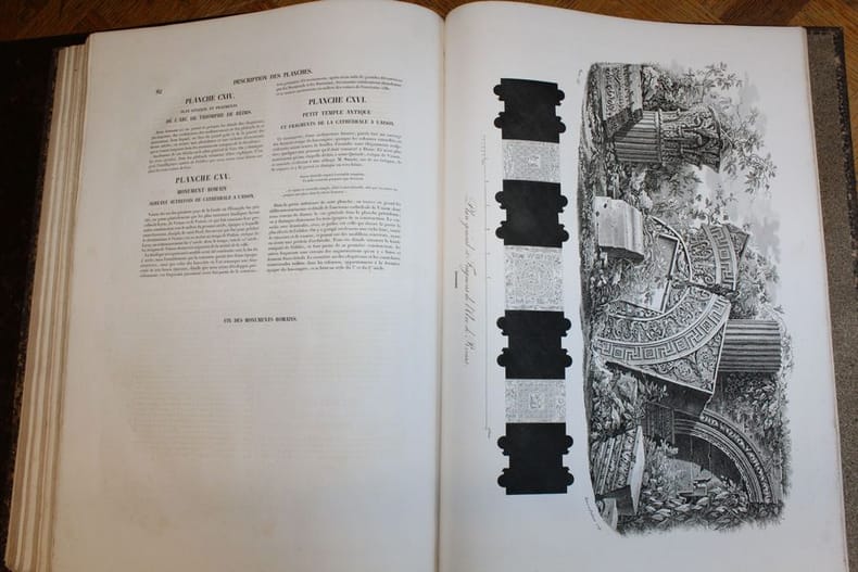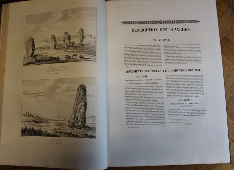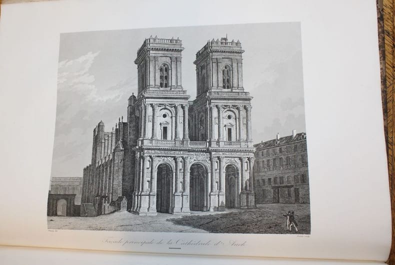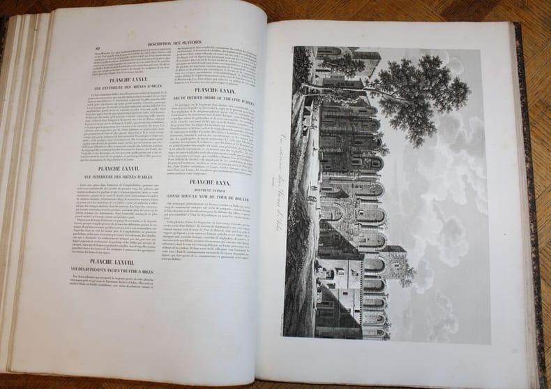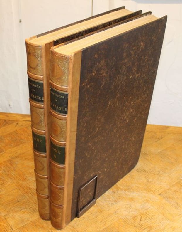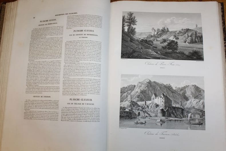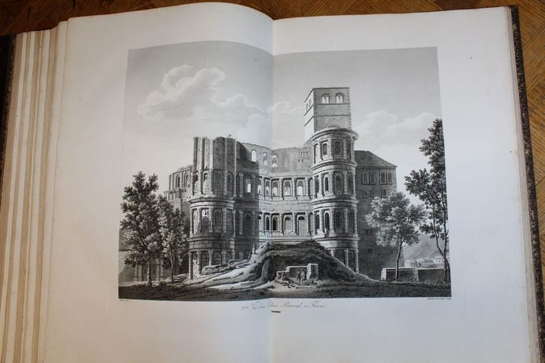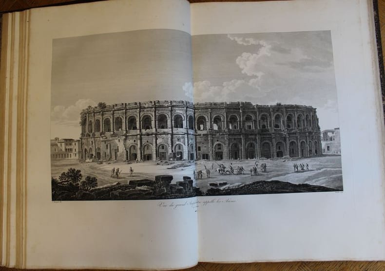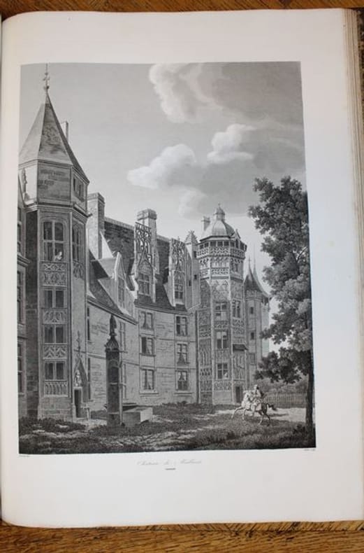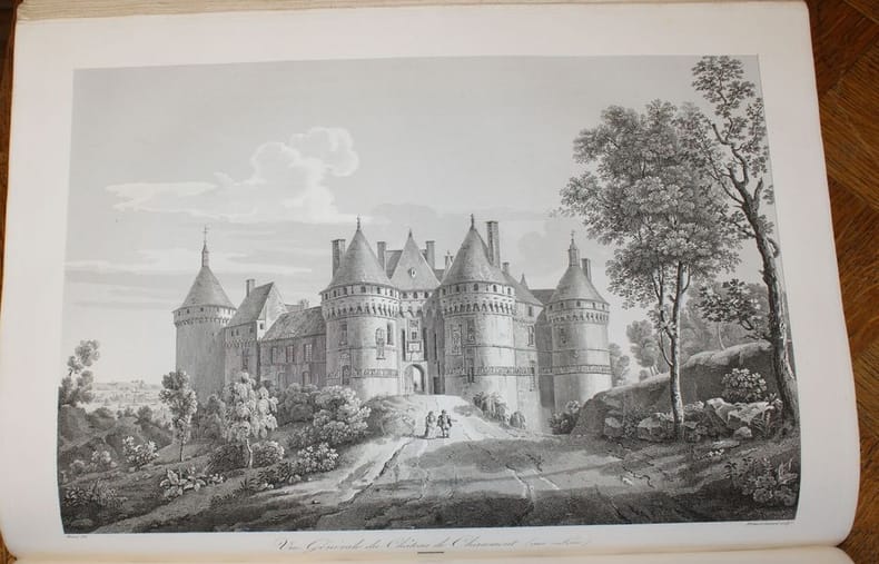 Rare édition originale magnifiquement illustrée. L'illustration se compose d'un frontispice et de 259 planches hors texte, dont 23 à double page, contenant plus de 300 sujets, lithographiées par Baltard, Réville, Malbeste, d'après les dessins de Constant Bourgeois, Nicolas Chapuy et Bance, qui avaient consacré plusieurs années à parcourir la France et qui devinrent, après 1820, les artisans des grands recueils lithographiques. «L'héritage de tous les siècles» se trouve ici rassemblé, l'auteur voulant montrer que la France est, de toutes les contrées, la plus riche en monuments de tous les âges. Tiré de l'avant propos " Dans le premier volume, nous avons décrit la plus grande partie des monuments celtiques et romains... Second volume doit contenir la description des édifices civils et religieux élevés sous le règne de nos Rois...Nous y avons signalés trois genres d'architecture.. Style roman ou à plein-cintre, appelé indistinctment saxon ou lombard ; le style ogivique, dit improprment gothique ou arabesque, et le style de la renaissance". Précieuse édition de cet important ouvrage illustrant de la plus belle des manières les monuments des villes de Sens, Joigny, Vézelay, Cavaillon, Vienne, Fréjus, Aix, Reims, Avignon, Bordeaux, Toulouse, Autun, Toul, Lyon, Chartres, Paris, Tours (la planche 184 se trouve sur la planche 180) Vicaire IV, 749 ; Brunet III, 714.