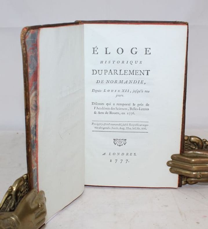 Discours qui a remporté le prix de l'Académie des Sciences, Belles-Lettres et Arts de Rouen en 1776. Exemplaire aux armes du baron Le Roux d'Esneval et d'Acquigny, conseiller au Parlement de Rouen en 1767 et président à mortier au même parlement en 1770. Très bel exemplaire. Frère; O.H.R. 196.