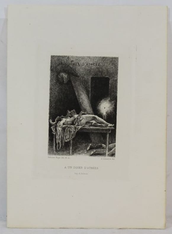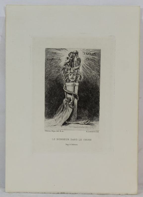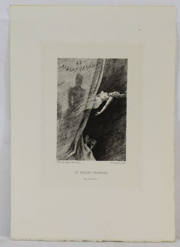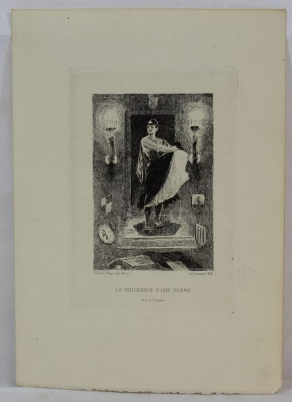 Belle suite sur vergé en très bon état composée des 9 eaux-fortes dessinées et gravées par Félcien Rops. Ces eaux-fortes creées entre 1882 et 1886 et étaient initialement destinées à une réédition des Diaboliques chez Lemerre. Celle-ci a cependant été publiée sans les gravures de Rops, de sorte que Lemerre les a éditées séparément.