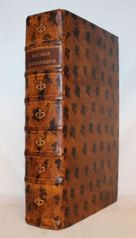 Brunet précise "que des trois volumes que devait avoir cette collection, il n'est paru que celui-ci, lequel est fort recherché et se trouve difficilement". Ce recueil dédié au Clergé, au Parlement et au Peuple de Rouen contient 17 textes, chroniques, annales d'historiens normands rédigés en latin, dont Abbon sur le siège de Paris, Orderic Vital, Dudon de Saint Quentin, la Chronique de Normandie, les Annales de Saint Etienne de Caen, etc... Ouvrage incontournable pour ceux qui veulent étudier l'Histoire de Normandie, les conquêtes des Normands en Italie et l'Histoire d'Angleterre sous la dynastie normande. Bon exemplaire agréablement relié au XIXème par Messier. Relieur de l'époque romantique qui exerça 13, rue des Marais-Saint-Germain à Paris, de 1826 à 1842. Brunet II, 856.