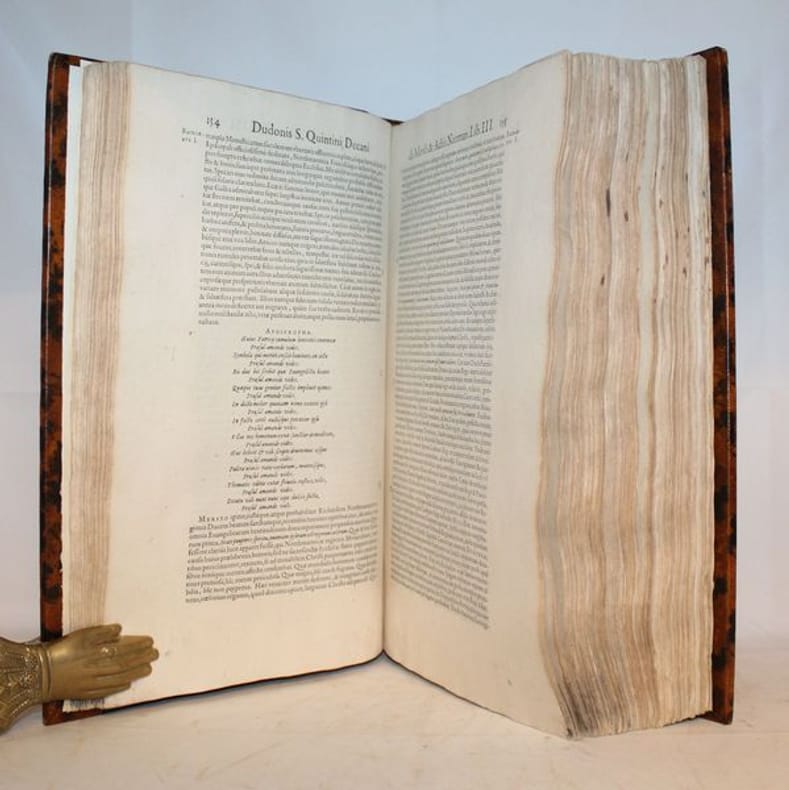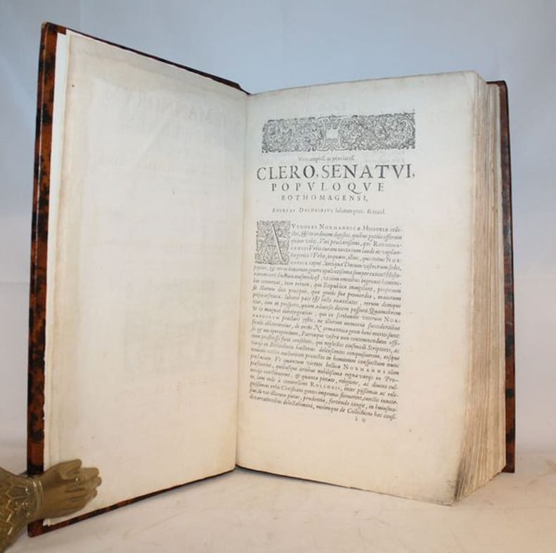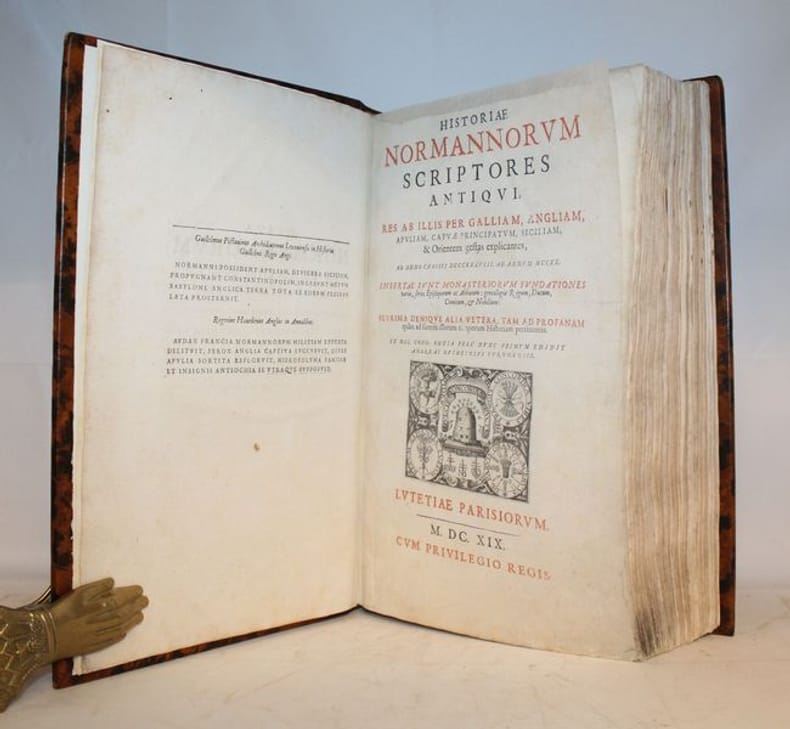 Brunet précise "que des trois volumes que devait avoir cette collection, il n'est paru que celui-ci, lequel est fort recherché et se trouve difficilement". Ce recueil dédié au Clergé, au Parlement et au Peuple de Rouen contient 17 textes, chroniques, annales d'historiens normands rédigés en latin, dont Abbon sur le siège de Paris, Orderic Vital, Dudon de Saint Quentin, la Chronique de Normandie, les Annales de Saint Etienne de Caen, etc... Ouvrage incontournable pour ceux qui veulent étudier l'Histoire de Normandie, les conquêtes des Normands en Italie et l'Histoire d'Angleterre sous la dynastie normande. Bon exemplaire grand de marge, agréablement relié en veau pastiche. Brunet II, 856.
