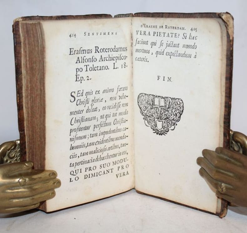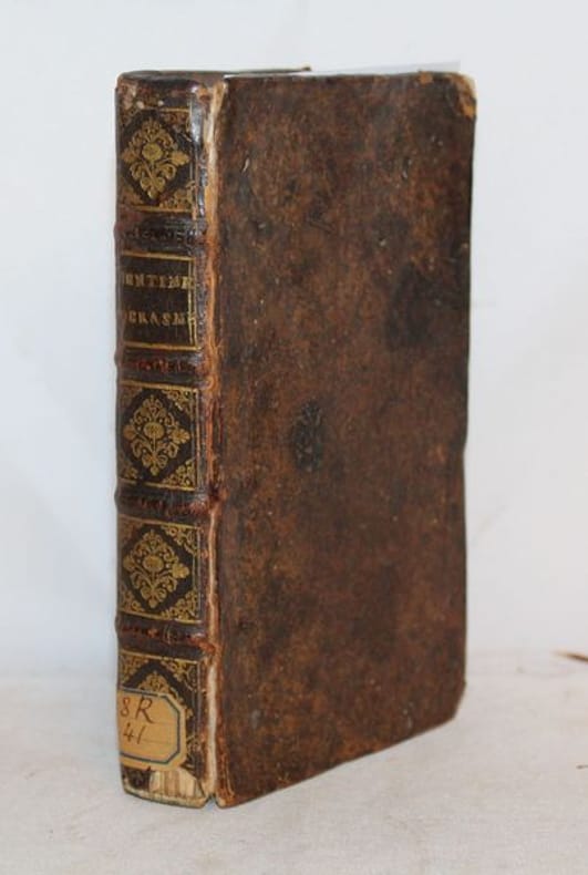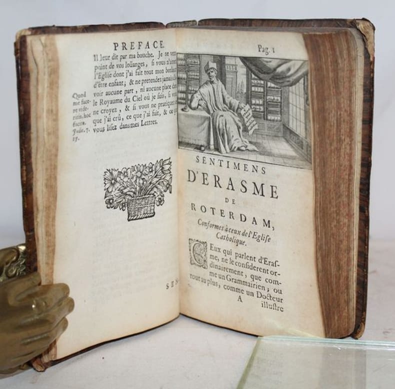 Cologne, Adrian Le Jeune, 1688. In-12, [36], 415 pp., frontispice représentant une statue d'Erasme et bandeau de l'auteur dans une bibliothèque (page 1). Veau d'époque, dos à nerfs orné (manque en pied, un mors fendu, coins émoussés).