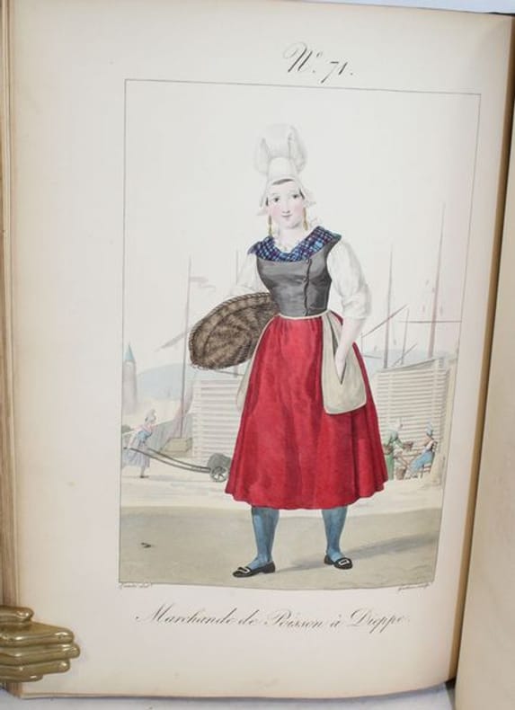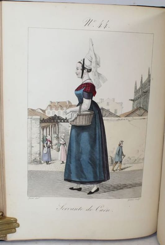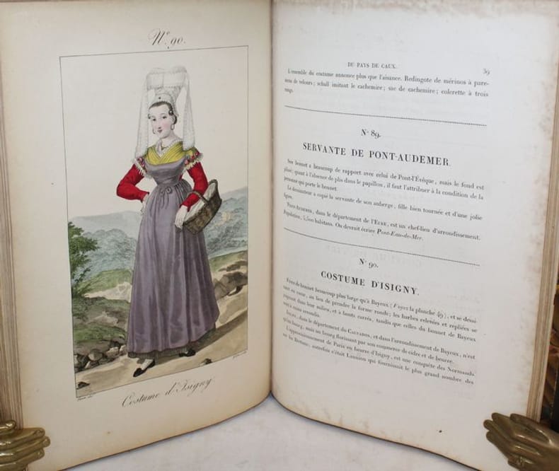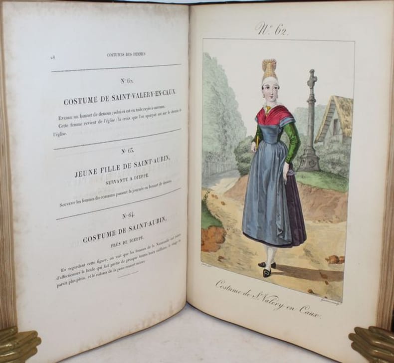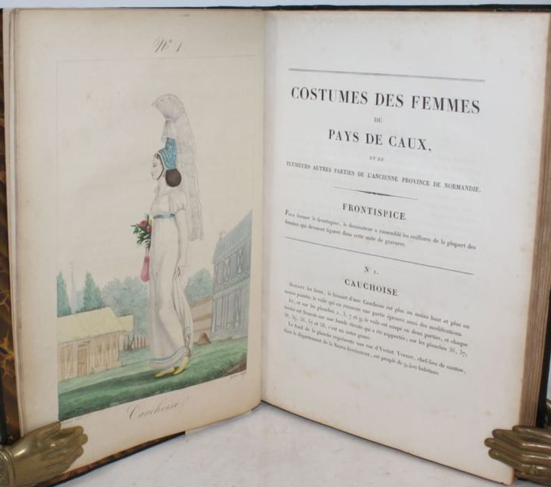 Magnifiques illustrations en couleurs de costumes normands principalement d'après Louis-Marie Lanté (quelques-unes d'après Pécheux), et rehaussées de couleurs. Pécheux, peintre de grand renom, spécialiste de fresques à l'italienne (il était né à Rome) travaillait en France depuis la campagne d'Italie et dirigeait un atelier de peintres italiens ambulants. En 1811, la fabrique de l'église d'Yvetot s'adresse à lui pour décorer la chapelle de la Vierge. La même année, il décore la coupole de Saint-Romain à Rouen. Il est aussi appelé à Limpiville, à Fécamp et au Havre. Les dimanches et jours de fête, il côtoie des Cauchoises parées de coiffes originales et il les dessine avant de rentrer à Paris. La Mésangère, qui dirige dans la capitale le Journal des Dames et des Modes, envoie à son tour un artiste chargé de faire un reportage plus complet: c'est Lanté qui, en 1819, va séjourner dans le Caux puis dans les autres parties de la province, fréquentant surtout les foires et les ports de la côte, pour fixer sur le papier les particularités du costume. Le premier tirage est daté 1827 et comprend 23 feuillets d'explication des planches. Après la mort de La Mésangère, cette collection passa dans les mains de M. Mancel qui fit graver un nouveau titre "Cent cinq costumes des départements..., Paris, Durand aîné. Dans ces exemplaires le texte est souvent absent. Colas (Bibliographie générale du costume et de la mode) en donne la description : « Je nai pas pu arriver à me persuader quil y ait eu réellement une seconde édition de ce recueil vers 1830 comme lindiquent Brunet et Vinet ; il me semble probable que les planches originales furent cédées à dautres éditeurs qui en firent des collections sans texte et avec le frontispice comme titre; ces éditeurs firent graver sur le frontispice leurs adresses ; il existe donc deux états du frontispice : sans ou avec ces adresses () Les planches de cette seconde émission me paraissent aussi bonnes que celles de la première». Exemplaire en bel état de fraîcheur et agréablement relié. Frère, M.Bruneau (Connaître Rouen) ; Colas 1770.