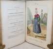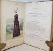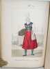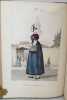 Magnifiques illustrations en couleurs de costumes normands principalement d'après Louis-Marie Lanté (quelques-unes d'après Pécheux), et rehaussées de couleurs. Pécheux, peintre de grand renom, spécialiste de fresques à l'italienne (il était né à Rome) travaillait en France depuis la campagne d'Italie et dirigeait un atelier de peintres italiens ambulants. En 1811, la fabrique de l'église d'Yvetot s'adresse à lui pour décorer la chapelle de la Vierge. La même année, il décore la coupole de Saint-Romain à Rouen. Il est aussi appelé à Limpiville, à Fécamp et au Havre. Les dimanches et jours de fête, il côtoie des Cauchoises parées de coiffes originales et il les dessine avant de rentrer à Paris. La Mésangère, qui dirige dans la capitale le Journal des Dames et des Modes, envoie à son tour un artiste chargé de faire un reportage plus complet: c'est Lanté qui, en 1819, va séjourner dans le Caux puis dans les autres parties de la province, fréquentant surtout les foires et les ports de la côte, pour fixer sur le papier les particularités du costume. Premier tirage daté 1827 avec les 23 feuillets d'explication des planches. Edition originale en bon état de fraîcheur, bien complète des 105 planches et du texte. Frère, M.Bruneau (Connaître Rouen) ; Colas 1770.
