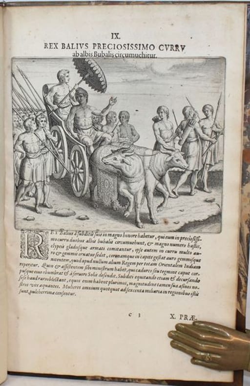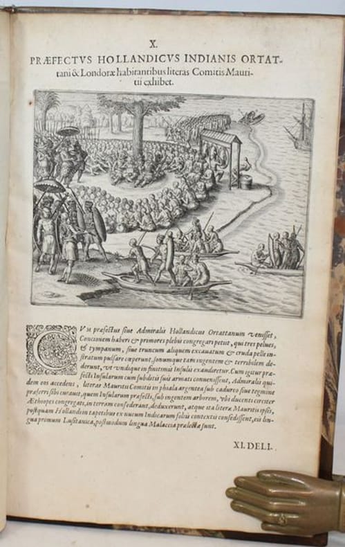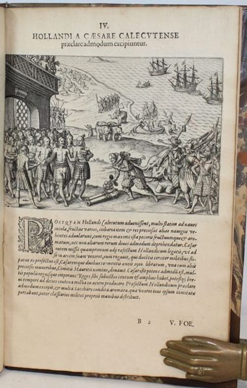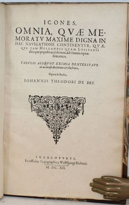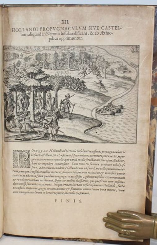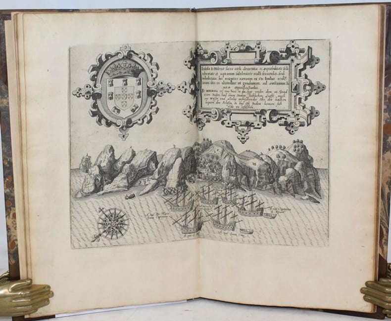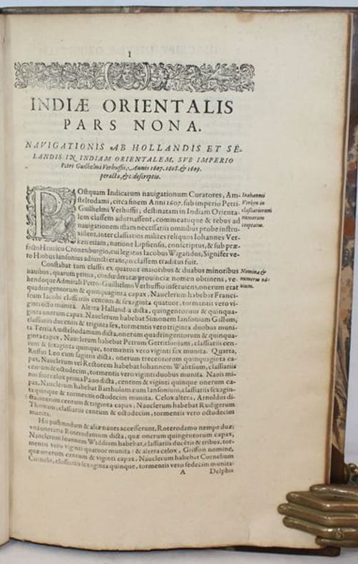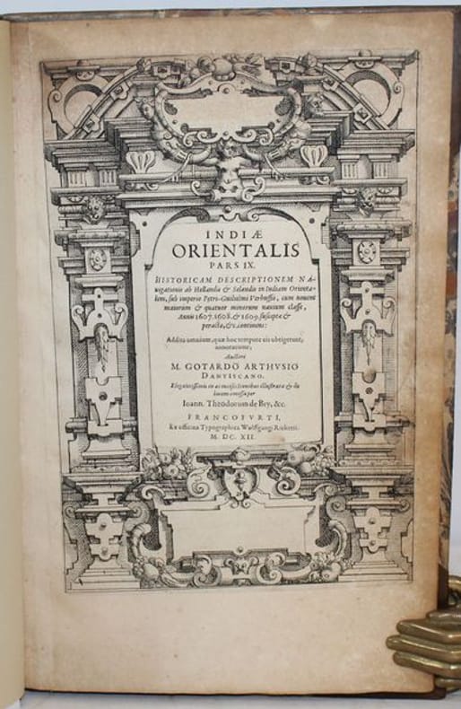 Première édition et première issue (sans le mot Arhitectvra au titre) qui constitue la neuvième partie des Petits voyages de Theodor de Bry, imprimés en 13 parties de 1597 à 1633. Celle-ci est compilée par Arthus Gotthard à partir du récit écrit par Johann Vercken, l'un des officiers de la flotte, qui avait participé à l'expédition mais n'était revenu en Hollande qu'en 1612. Pieter Willemszoon Verhoeff, amiral néerlandais (mort en 1609), commanda de 1607 à 1609 l'une des dernières expéditions de la première phase de l'occupation néerlandaise des Indes orientales. Ses instructions, outre la destruction d'un maximum de navires ibériques, étaient de chasser les Espagnols et les Portugais des Moluques. La flotte de Verhoeff, composée de treize navires, quitta Amsterdam en décembre 1607. Après une attaque infructueuse contre les positions portugaises au Mozambique en juillet 1608, il se dirigea vers la côte de Coromandel, en Inde, où il renouvela son alliance avec le Zamorin de Calcutta. Une fois aux Indes orientales, un détachement de deux navires sous le commandement de Nicolas Puyck se rendit au Japon, où il fut bien accueilli par le Shogun et obtint des privilèges commerciaux accrus. Bien qu'ayant reçu l'ordre d'assiéger Malacca et d'établir des relations commerciales avec la Chine, aucune des instructions de Verhoeff ne fut pleinement exécutée, et Malacca ne tomba aux mains des Hollandais qu'en 1641. Dans les Moluques, de nouveaux forts furent construits à Amboine et à Banda, mais Ternate resta aux mains des Espagnols.« Un détachement de la flotte sous les ordres du vice-amiral François Wittert bloqua Manille pendant six mois, jusqu'à sa destruction en grande partie par une flotte espagnole commandée par Juan de Silva. Au total, Verhoeff perdit six de ses navires et une grande partie de son équipage, y compris tout le commandement d'origine. Verhoeff lui-même, ainsi que plusieurs membres de son conseil de bord, dont le principal marchand, Johan de Moelre, furent tués dans une embuscade tendue par Bandanese en mai 1609. » Ouvrage bien complet pour cette première partie de l'Indiae Orientalis pars IX. Un supplément de Matthias Beckeren paru en 1613 avec 5 pl. ""Svpplementvm nonae partis Indiae Orientalis". Provenance : De la bibliothèque Norwich avec son ex-libris contrecollé par Léo Wyatt, montrant un squelette avec des outils de navigation fonctionnant à côté de l'oeuvre de Tachard, Leo Africanus etc