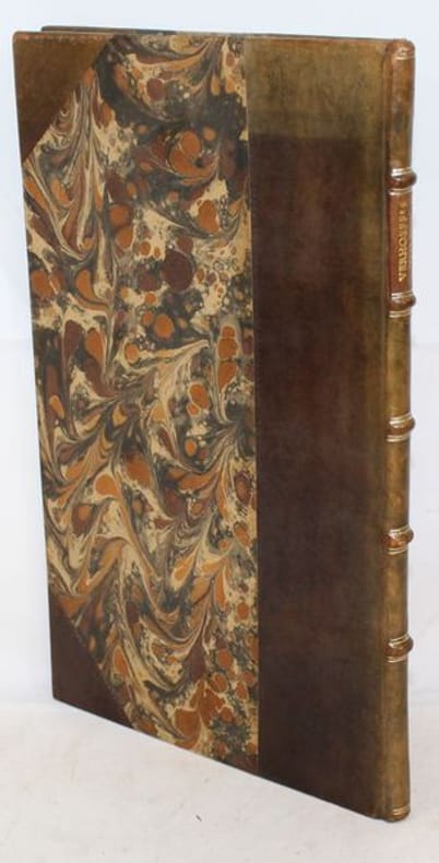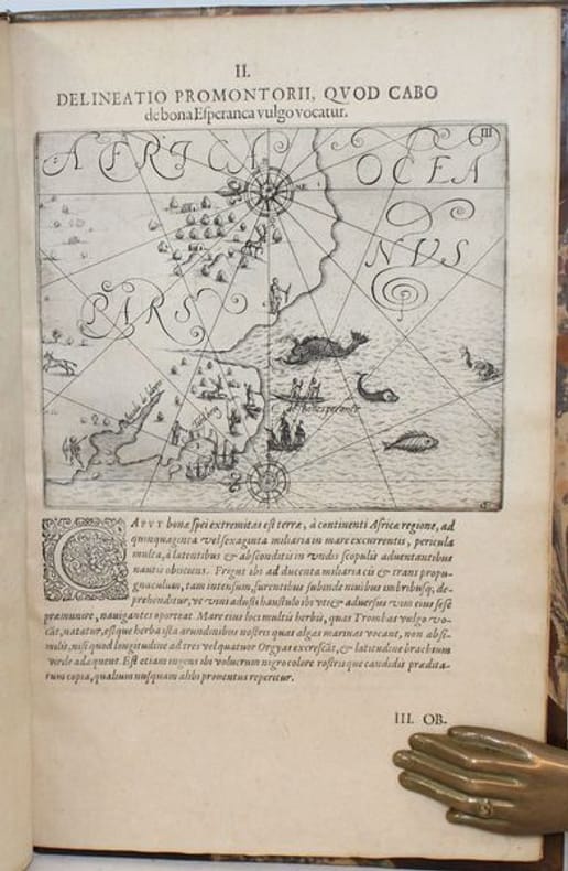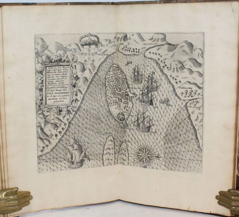 Wolfgang Richter, Frankfurt, 1612. Petit in-folio, (2)ff. dont le titre gravé, 49 pages, (1)f.blc. ; (2)ff. et XII planches gravées sur demi-page avec texte d'accompagnement, 2 cartes sur double page du Mozambique et de Sainte-Hélène. Légères brunissures marginales aux Ier et dernier feuillet, intérieur frais. Demi-veau brun à coins, dos à nerfs. Reliure du XIXème. (minime frottement à la coiffe sup).