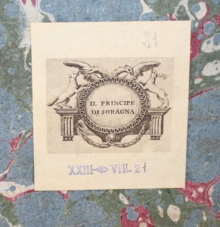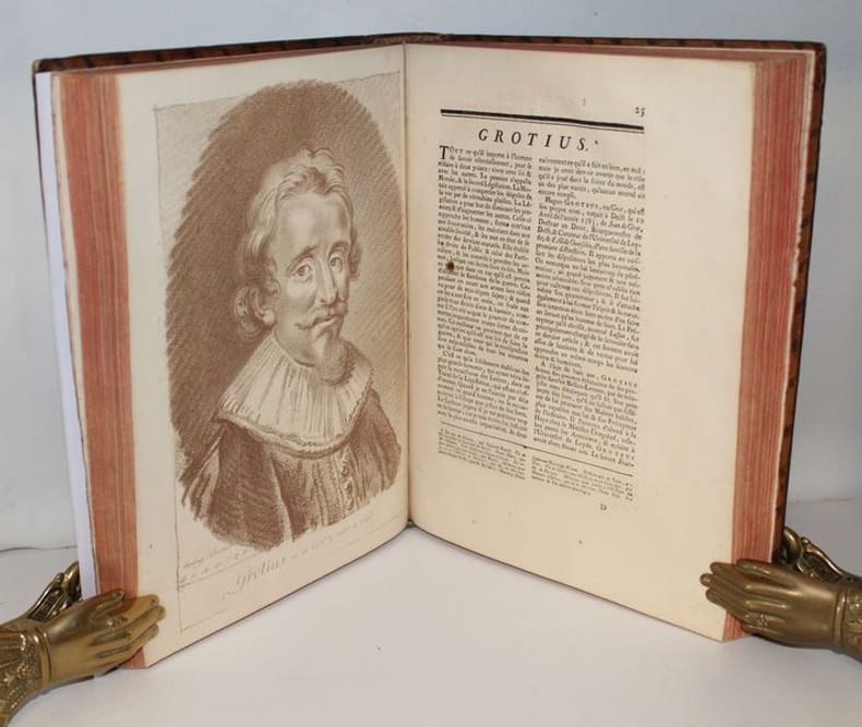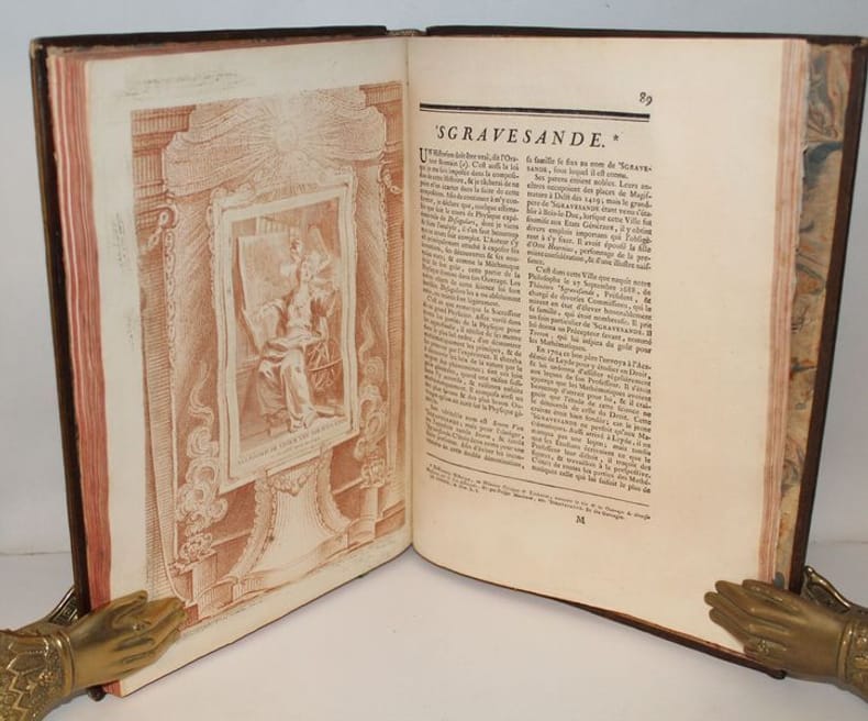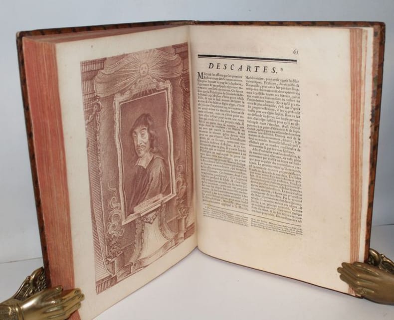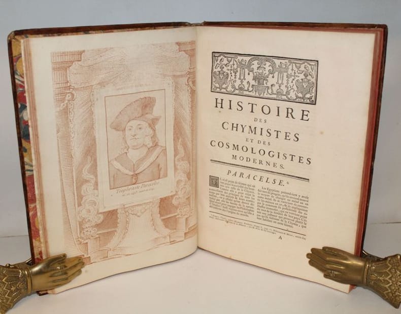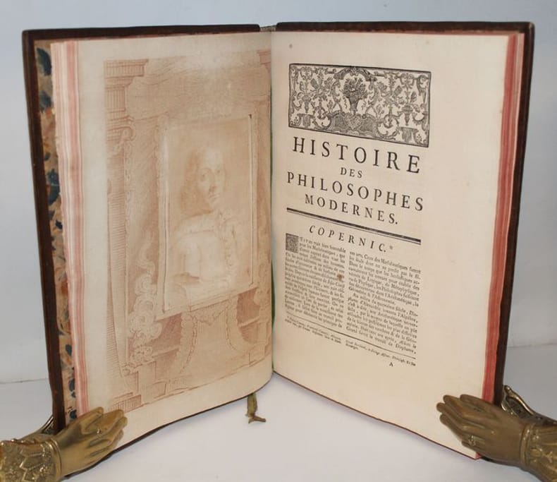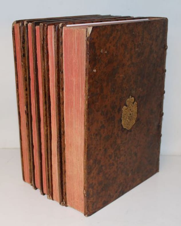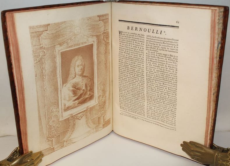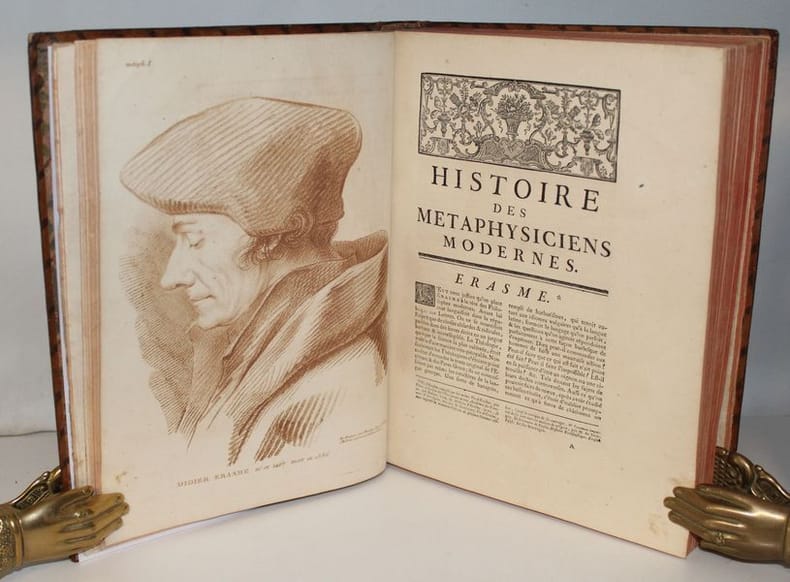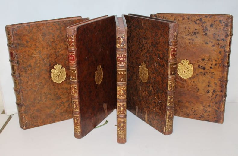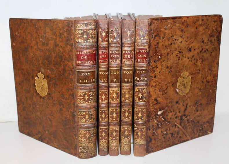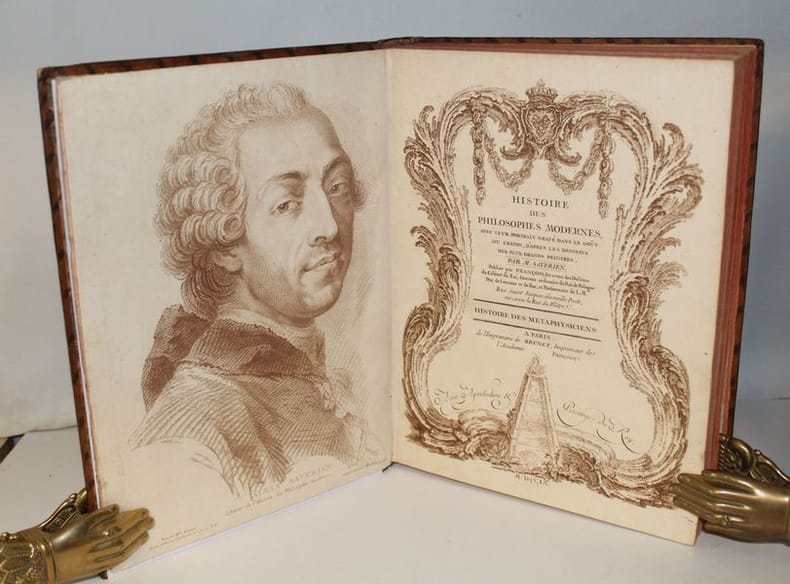 Luxueuse édition in-4 de cet ouvrage précieux pour son illustration, gravée à la manière du crayon et tirée en sanguine. C'est l'oeuvre du graveur Jean-Charles François qui fit de nombreuses découvertes dans l'art de la gravure, imitant le dessin et même l'aquarelle d'une façon extraordinaire (Benezit). Graveur et imprimeur français, ayant obtenu le titre de « Graveur des Desseins du Cabinet du Roi », il fut le promoteur en France d'une façon de reproduire le trait des dessins en gravure, appelée manière de crayon, qui combine l'usage d'un vernis mou, d'une roulette et d'un instrument composé de fines aiguilles, et de procédés de gravure préfigurant l'aquatinte. L'illustration se compose de 8 frontispices allégorique, 8 titres-frontispices et 75 portraits ou allégories hors texte (dont plusieurs répétées) des principaux philosophes et savants modernes accompagnés de notices biographiques d'après Alexandre Julien Savérien, philosophe et mathématicien, ami de Bernoulli, qui composa en 1742 un Discours sur la navigation et la physique expérimentale. Les principaux personnages cités sont Érasme, Hobbes, Locke, Spinoza, Grotius, Montaigne, La Bruyère, La Rochefoucault, Bacon, Gassendi, Descartes, Pascal, Newton, Leibnitz, Halley, Bernoulli, Copernic, Tycho-Brahé, Galilée, Kepler, Cassini, Huygens, Rohault, Molières, Gravesande, Paracelse, Lemery, Boerhaave, Agricola, Belon, Tournefort, Réaumur, etc. L'édition originale de l'ouvrage a paru entre 1760 et 1769, en 8 tomes in-4 et in-12. Certains tomes sont en réédition dans notre exemplaire, comme c'est le cas dans les seuls autres exemplaires rencontrés. En voici la composition : I. Histoire des métaphysiciens, 1760 (12 pl.) II. Histoire des moralistes et des législateurs, 1761 (12 pl.) III-IV. Histoire des restaurateurs des sciences, 1761 (23 pl.) V. Histoire des mathématiciens, 1765 (12 pl.) VI. Histoire des physiciens, 1768 (10 pl.) VII. Histoire des chimistes et des cosmologistes, 1769 (10 pl.) VIII. Histoire des naturalistes, 1773 (10 pl.). Seuls les tomes I et V ont un faux-titre ; celui du tome I porte une mention de seconde édition. Les biographies de Wollaston et de Shaftesbury sont ornées d'allégories, mais aussi de portraits, reliés à la fin des tomes III et IV. Exceptionnel exemplaire au format In-4, complet des illustrations, aux armes de la famille italienne Meli Lupi di Soragna, avec ex-libris d'un descendant titré prince de Soragna. Les Meli Lupi est une famille patricienne de Venise, et est celle des Marquis de Soragne. Cohen, 942 Brunet, V, 154.