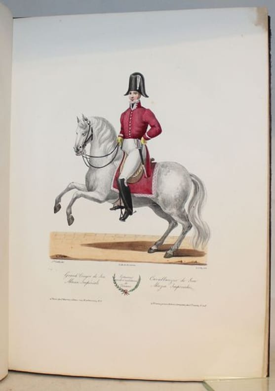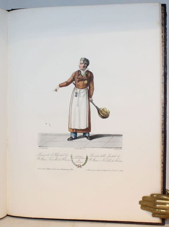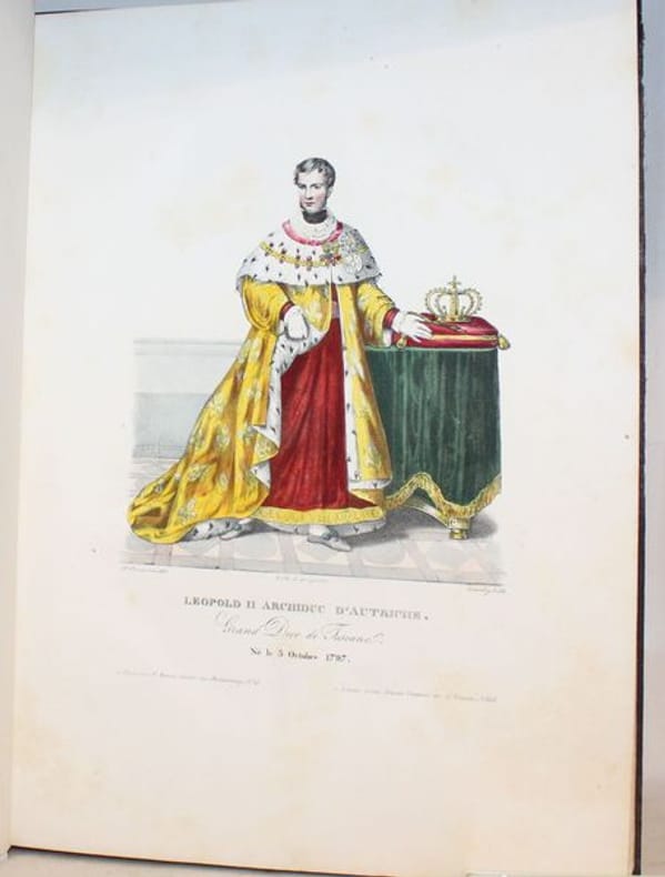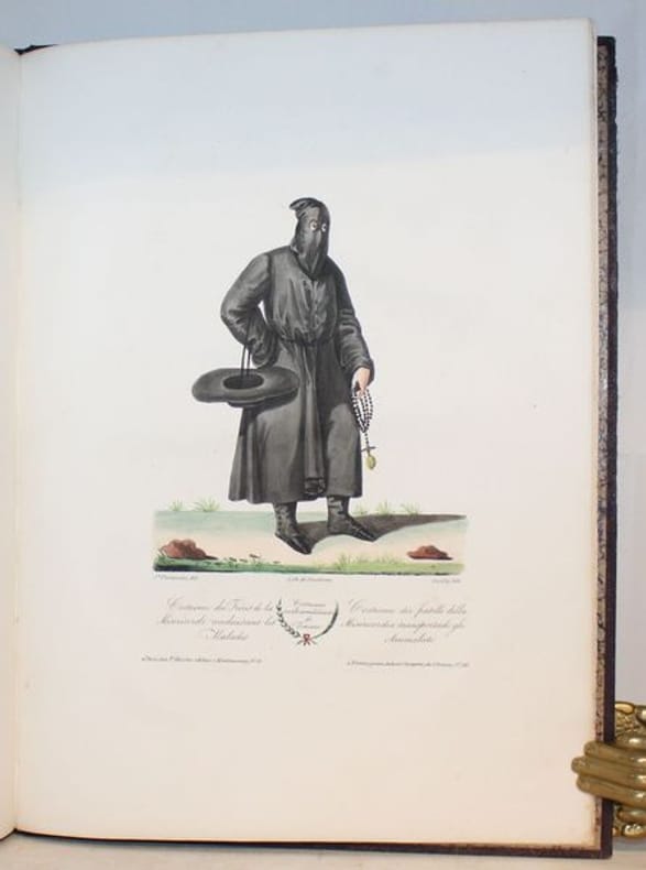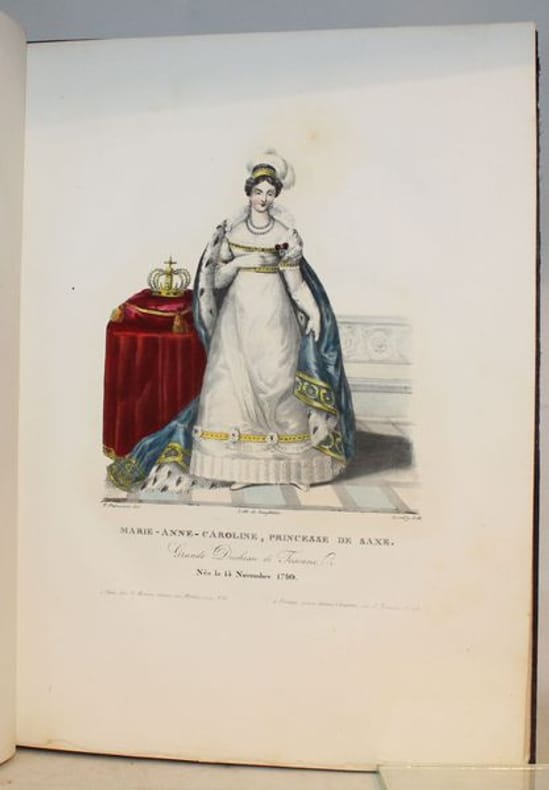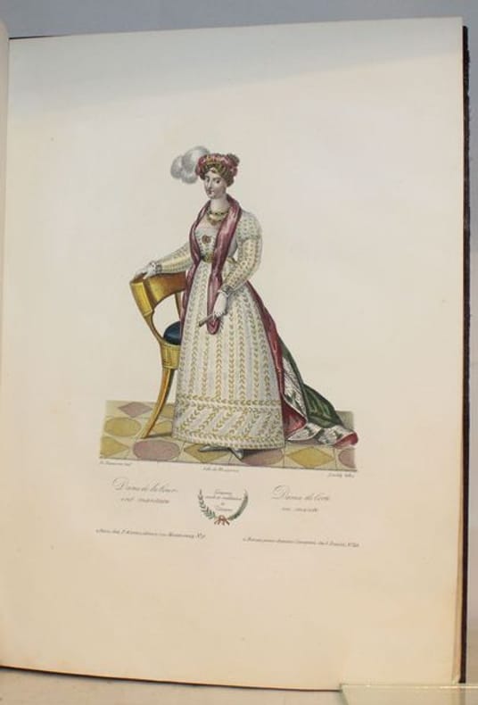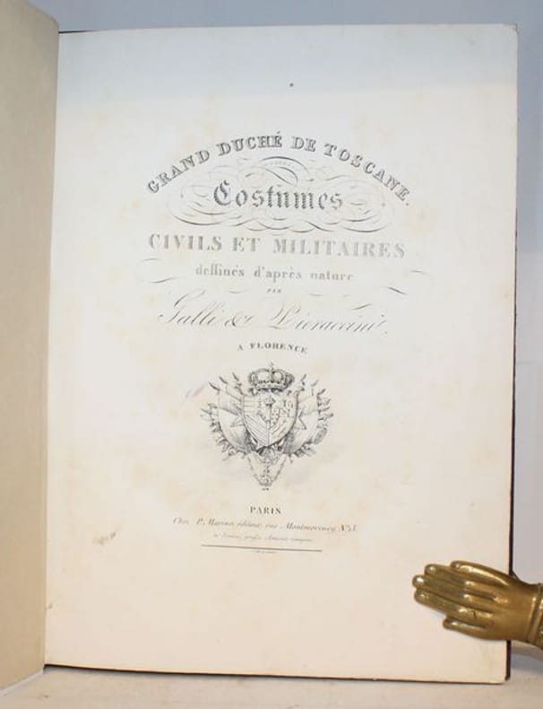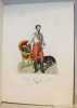 Rarissime suite de 50 lithographies en couleurs d'époque de costumes toscans. Les lithographies sont de Senefelder, Cosnier, Levilly et Ducarne, d'après les dessins de Galli et Pieraccini. Chaque planche est légendée en français et en italien. La page de titre, en français, est également lithographiée. Suite tirée de la Collection de costumes de diverses provinces du grand-duché de Toscane, du duché de Gênes et du Tyrol, lith. d'après des dessins de François Pieraccini de Florence. Paris (1826), gr. in-4, 130, dont 50 pour la Toscane, 40 pour le duché de Gênes et 40 pour le Tyrol. Bel exemplaire. Le costume historique de Racinet ; Catalogue de livres rares et précieux composant la première partie de la bibliothèque de M. J. Taylor N° 569.