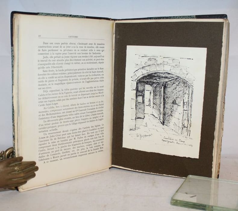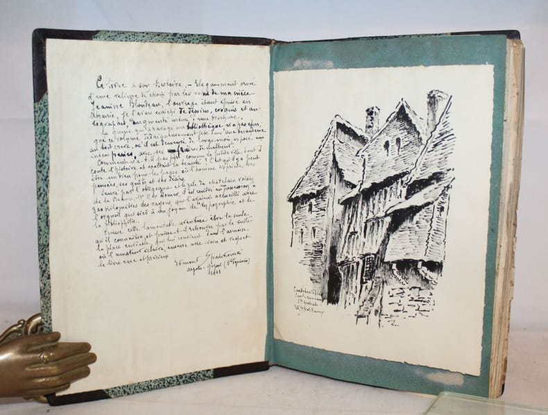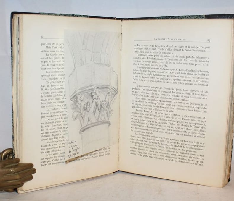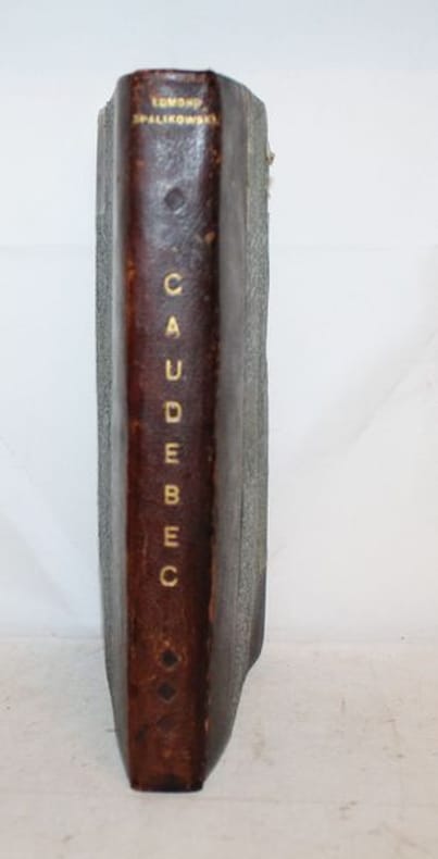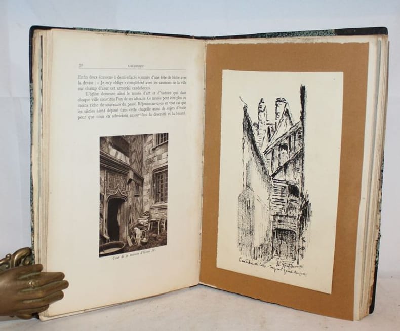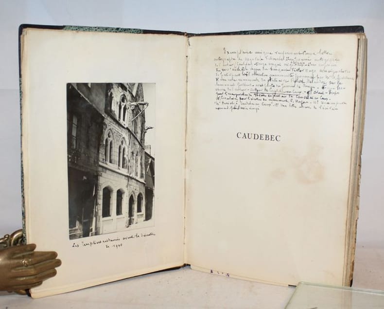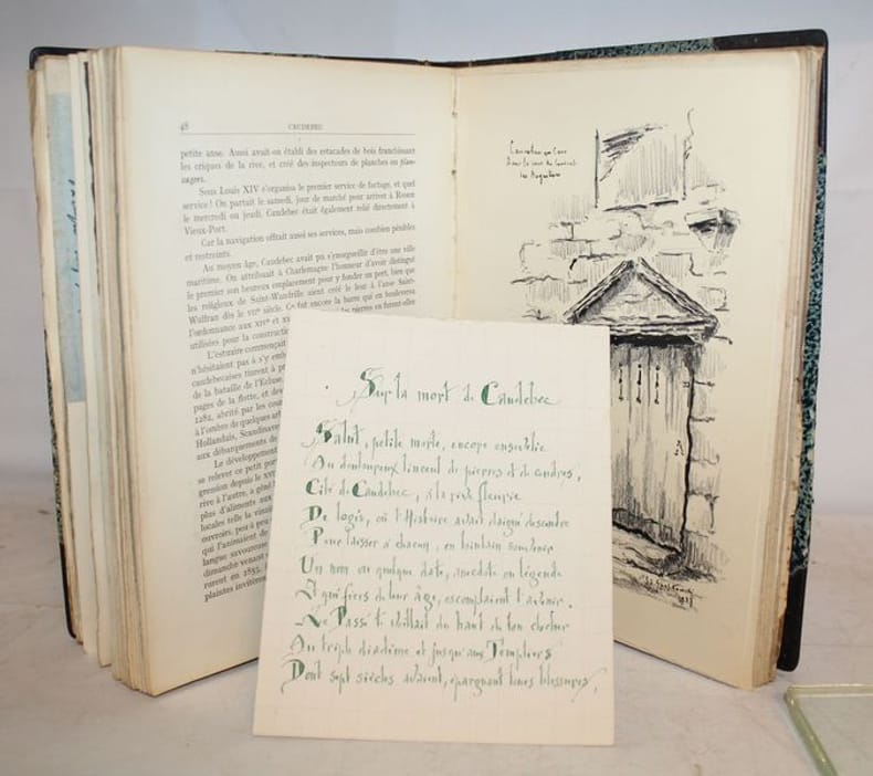 Exemplaire unique très enrichi de dessins, photographies, pièces manuscrites, etc... Dans une note en tête du livre l'auteur raconte "Ce livre a son histoire. Elégamment orné d'une reliure de choix par les soins de ma nièce Jeannine Blondeau, l'ouvrage étant épuisé en librairie, je l'avais enrichi de dessins, croquis....La guerre qui a ravagé ma bibliothèque n'a pas épargné ce volume dédaigneusement jeté dans une buanderie au toit crevé, où il est demeuré de longs mois exposé aux intempéries avec ses frères de malheur. Comment n'a-t-il pas péri comme la petite ville dont il conte l'histoire et exaltait la beauté ? C'est qu'il y a peut-être un dieu pour les pages où l'homme exprime ses pensées, ses goûts et ses désirs...puisse-t-il retrouver par la suite la place enviable qui lui convient dans l'armoire où l'amateur éclairé insère avec soin et respect le livre rare et précieux." Argelès-Gazost 1943. Liste dressée par l'auteur: - LAS de Monseigneur de la Villerabel, archevêque de Rouen. - poème autographe de l'auteur "Caudebec" (2 pp. In-8). - 11 croquis originaux parfois rehaussés d'aquarelle (en réalité 20). - un imprimé du XVIII ème siècle (convocation du commissaire de police de Caudebec). - le menu du banquet Victor Hugo avec signature des participants et l'allocution manuscrite du discours prononcé par M. Spalikowski (signatures de François Victor Hugo, M. Lefevre Vacquerie, Le Beau gouverneur de l'Algérie, etc...). - une note manuscrite du statuaire Robert Delandre sur le monument Guilbaud-Amundsen. - Une brochure de l'auteur " Autour de Caudebac en Caux". - Avant-Propos pour l'inauguration du Théâtre en Plein-Air de Caudebec. - Circulaire pour l'érection du Monument Victor Hugo. En plus des documents ci-dessus nous avons: - Une photographie de la maison des Templiers restaurée avant le désastre de 1940. - 3 LAS du Procureur Général, du Premier Président de la Cour d'Appel, du Préfet. - Un poème manuscrit sur "La mort de Caudebec" (4 pp. In-8 calligraphiées à l'encre verte). - Carte postale représentant le monument de Victor Hugo à Villequier (aujourd'hui disparu) dédicacée à Spalikowski par son sculpteur A. Maillard. - Poème manuscrit de l'auteur "A Notre Dame de Caudebec" (2 pp. In-8). - Poème manuscrit de l'auteur "Les Templiers" (1 p. In-8). - Manuscrit inédit de l'auteur de 28 pp. Recto sur papier d'écolier: "La Ville morte (Caudebec en Caux). - nombreuses coupures de journaux.