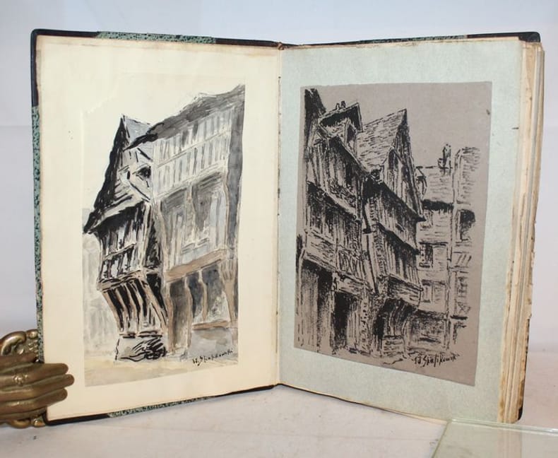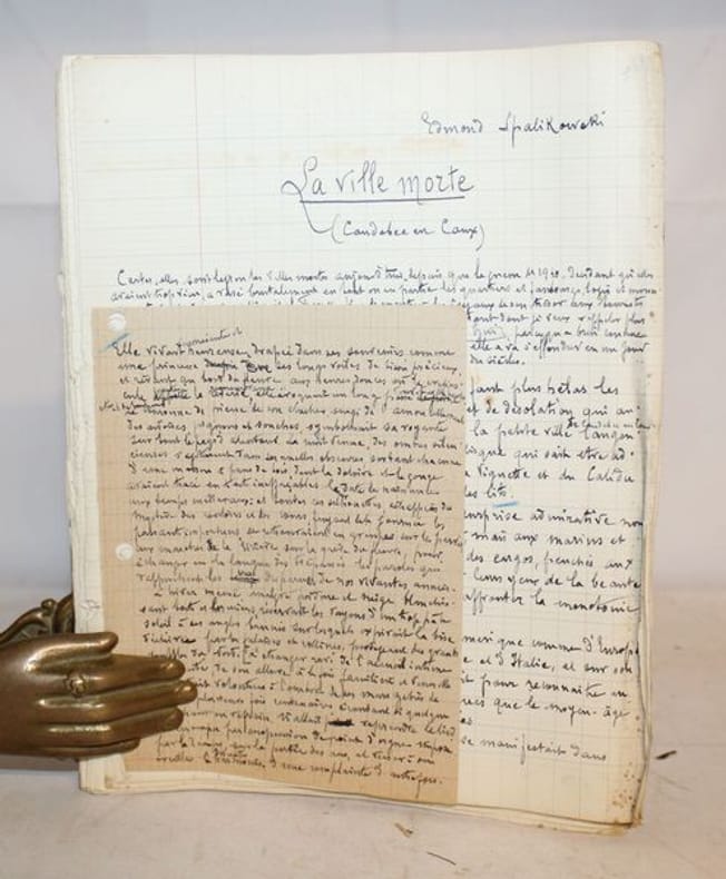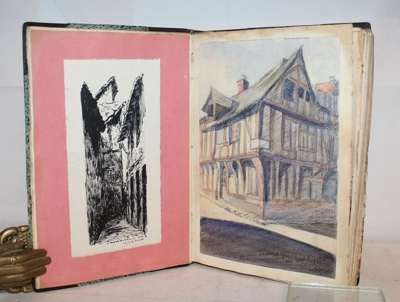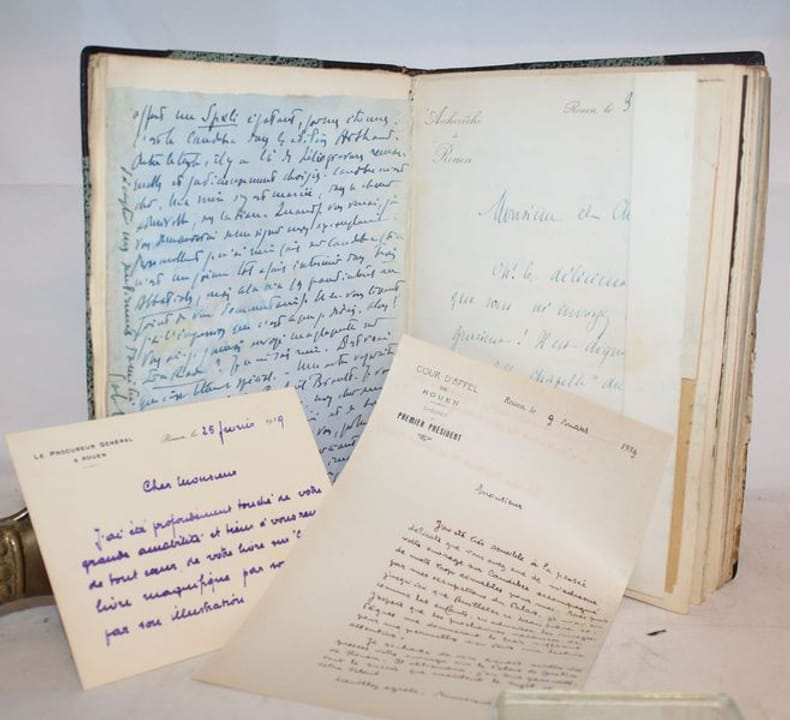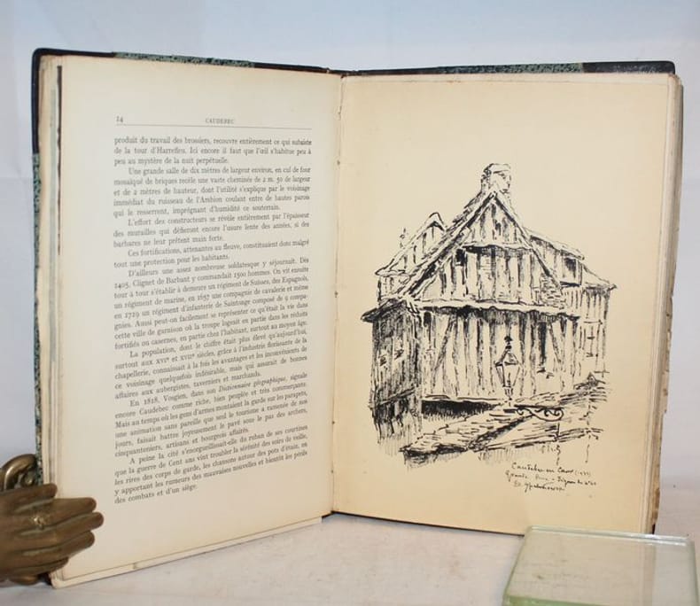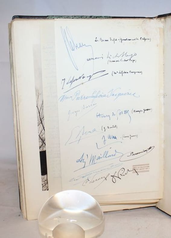 Exemplaire unique très enrichi de dessins, photographies, pièces manuscrites, etc... Dans une note en tête du livre l'auteur raconte "Ce livre a son histoire. Elégamment orné d'une reliure de choix par les soins de ma nièce Jeannine Blondeau, l'ouvrage étant épuisé en librairie, je l'avais enrichi de dessins, croquis....La guerre qui a ravagé ma bibliothèque n'a pas épargné ce volume dédaigneusement jeté dans une buanderie au toit crevé, où il est demeuré de longs mois exposé aux intempéries avec ses frères de malheur. Comment n'a-t-il pas péri comme la petite ville dont il conte l'histoire et exaltait la beauté ? C'est qu'il y a peut-être un dieu pour les pages où l'homme exprime ses pensées, ses goûts et ses désirs...puisse-t-il retrouver par la suite la place enviable qui lui convient dans l'armoire où l'amateur éclairé insère avec soin et respect le livre rare et précieux." Argelès-Gazost 1943. Liste dressée par l'auteur: - LAS de Monseigneur de la Villerabel, archevêque de Rouen. - poème autographe de l'auteur "Caudebec" (2 pp. In-8). - 11 croquis originaux parfois rehaussés d'aquarelle (en réalité 20). - un imprimé du XVIII ème siècle (convocation du commissaire de police de Caudebec). - le menu du banquet Victor Hugo avec signature des participants et l'allocution manuscrite du discours prononcé par M. Spalikowski (signatures de François Victor Hugo, M. Lefevre Vacquerie, Le Beau gouverneur de l'Algérie, etc...). - une note manuscrite du statuaire Robert Delandre sur le monument Guilbaud-Amundsen. - Une brochure de l'auteur " Autour de Caudebac en Caux". - Avant-Propos pour l'inauguration du Théâtre en Plein-Air de Caudebec. - Circulaire pour l'érection du Monument Victor Hugo. En plus des documents ci-dessus nous avons: - Une photographie de la maison des Templiers restaurée avant le désastre de 1940. - 3 LAS du Procureur Général, du Premier Président de la Cour d'Appel, du Préfet. - Un poème manuscrit sur "La mort de Caudebec" (4 pp. In-8 calligraphiées à l'encre verte). - Carte postale représentant le monument de Victor Hugo à Villequier (aujourd'hui disparu) dédicacée à Spalikowski par son sculpteur A. Maillard. - Poème manuscrit de l'auteur "A Notre Dame de Caudebec" (2 pp. In-8). - Poème manuscrit de l'auteur "Les Templiers" (1 p. In-8). - Manuscrit inédit de l'auteur de 28 pp. Recto sur papier d'écolier: "La Ville morte (Caudebec en Caux). - nombreuses coupures de journaux.