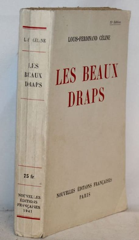 Paris Nouvelles Editions f 1941 In-12, broché, couverture imprimée.Edition originale du quatrième et dernier pamphlet politique de Céline, qui fut publié par une filiale dédition que Robert Denoël fonda le 20 novembre 1940, pour pallier la fermeture par loccupant des Éditions Denoël, et dont les publications seront prétexte à un procès (la première collection traite des juifs en France). Le titre original Notre-Dame de la Débinette, a été remplacé par Les Beaux Draps, renvoyant clairement à la situation déplorable de la France qui na pas écouté les avertissements céliniens, et à la débâcle de juin 1940. Un des 245 exemplaires numérotés sur pur fil Lafuma, seul tirage sur grand papier avec 60 exemplaires sur vergé d'Arches. De la bibliothèque Patrice Espiau-Roussel (ex-libris).