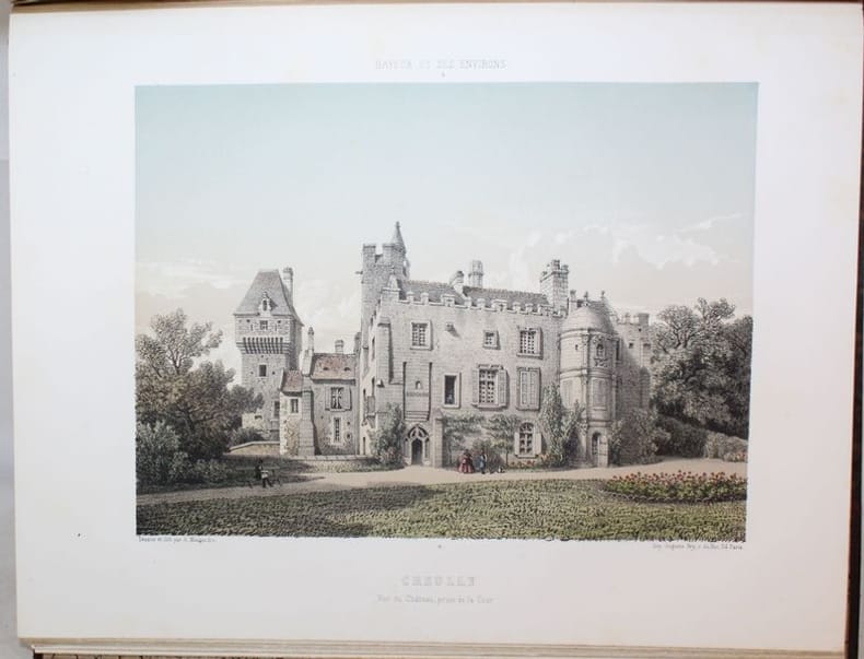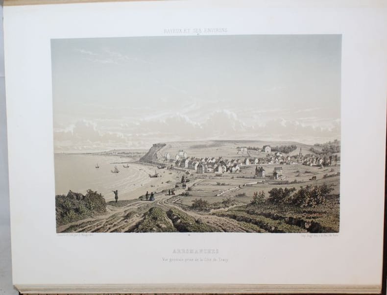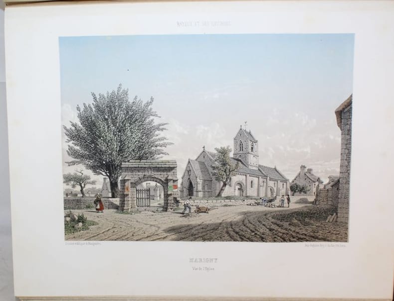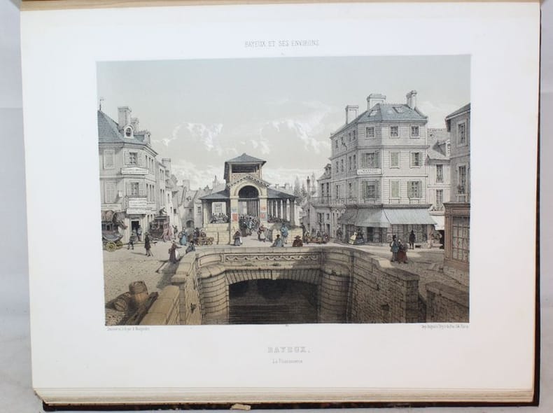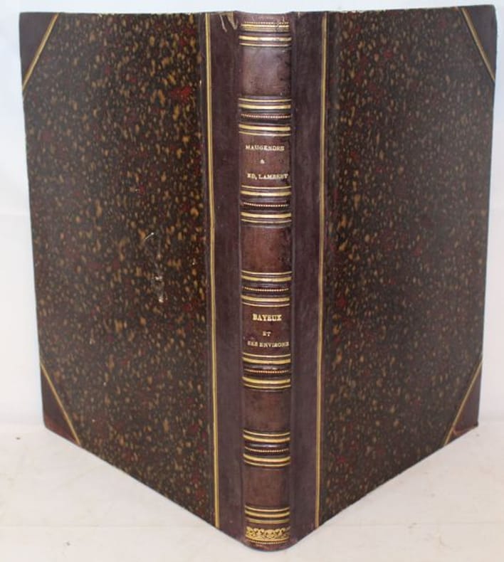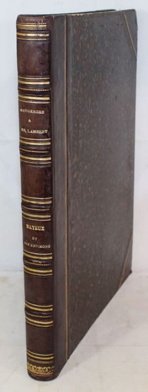 Paris, Renou et Maulde, 1862-1865. Petit in-folio (marg. 26 x 34 cms), monté sur onglets. Sept notices indépendantes composées par le conservateur de la Bibliothèque de Bayeux. I. Bayeux et ses environs (23 pp.). - II. Appendice (8 pp.). - III. Canton de Balleroy (9 pp.). - IV. Canton de Caumont (9 pp.). - V. Canton dIsigny (11 pp.). - VI. Canton de Ryes ((25 pp.). - VII. Canton de Trévières (19 pp.). Les planches comprennent un titre en rouge, noir et or aux armes de la ville (daté 1865) et 46 vues hors texte dessinées et lithographiées en couleurs. Rousseurs dans le texte, intérieur frais pour les planches (sauf pour une pl. suppl. avec rousseurs et une petite déchirure sans atteinte à la gravure Place du Marché Littry.) Demi-basane prune à coins, dos à nerfs ornés, filets dorés. (éraflures aux plats, coins usés). Reliure de l'époque.