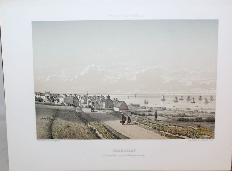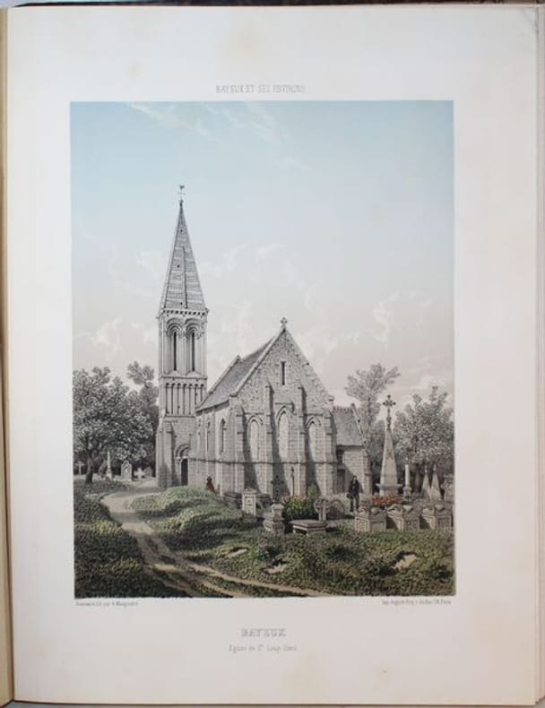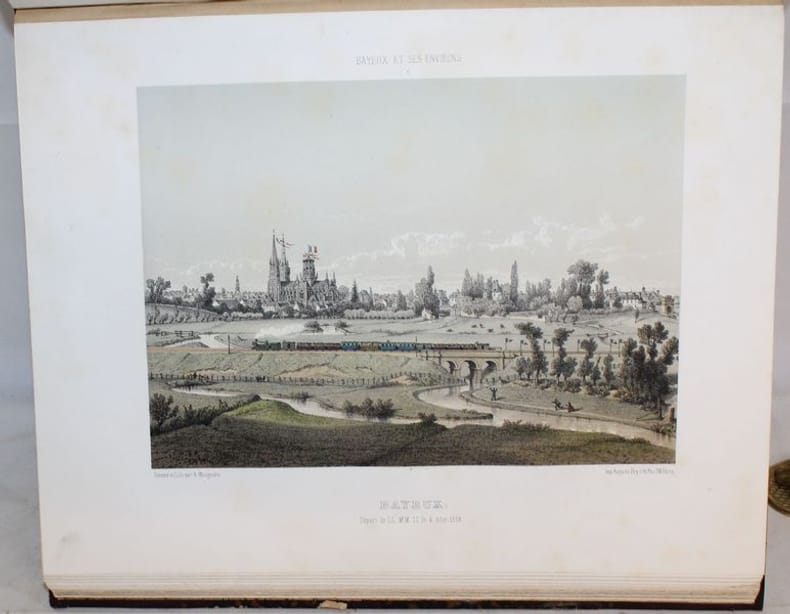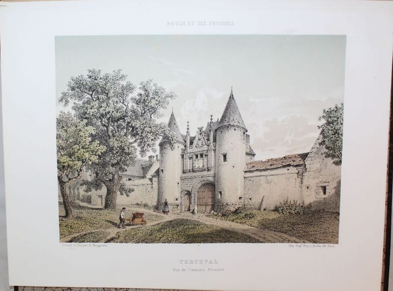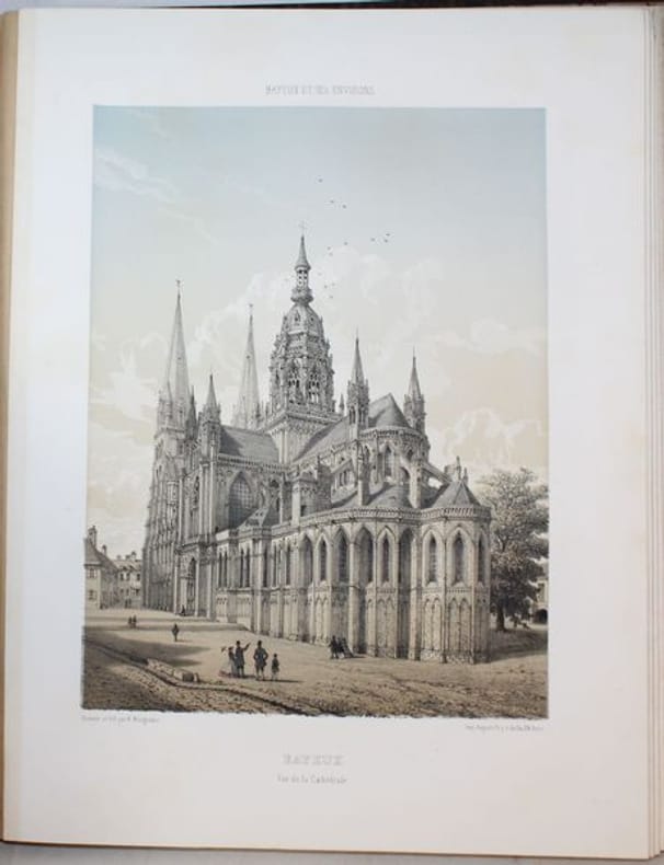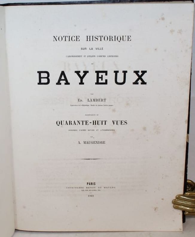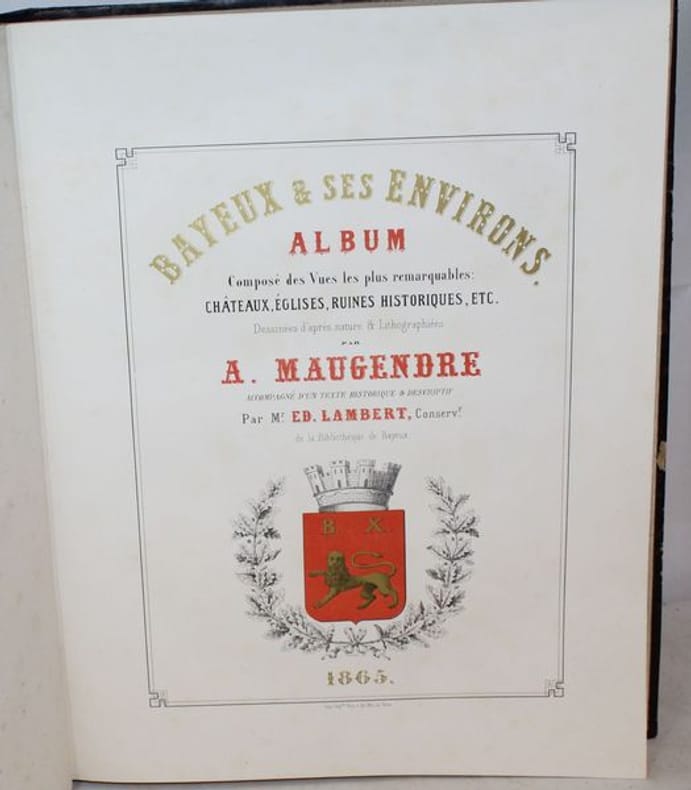 Superbe et rarissime album bien complet des 46 vues chromolithographiées de Bayeux et ses environs. Seulement 3 notices au CCF (BnF, Caen, Le Havre et un exemplaire à la médiathèque de Bayeux). Notre exemplaire contient 48 planches (46 + 2 suppl.) hors texte dessinées et lithographiées en couleurs par Adolphe Maugendre et tirées chez Auguste Bry à Paris, auxquelles s'ajoute un titre lithographié en rouge, noir et doré à la date de 1865. On y voit la cathédrale de Bayeux, les églises de Saint-Patrice, Saint-Loup-Hors et le monastère de Saint-Vigor-le-Grand, l'hôtel de ville, la poissonnerie et un spécimen de la tapisserie, ainsi que divers châteaux et monuments historiques des cantons de Balleroy, Caumont, Issigny, Ryes et Trévières, représentés d'après nature avec le souci du détail et l'exactitude que l'on reconnaît aux uvres du lithographe d'Ingouville. Le titre de la Notice (daté 1862) annonce 48 vues, la table des planches n'en dénombre que 46. Notre exemplaire possède 2 gravures de Maugendre supplémentaires aux 46 planches : une Façade de la Cathédrale et l'Avenue du chateau d'Etreham. Non référencé dans le Frère II,142.