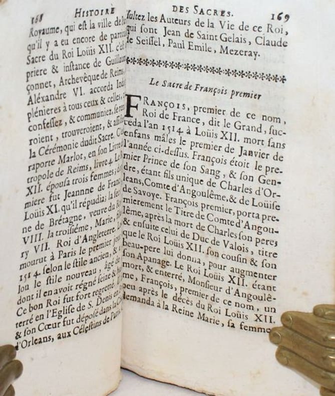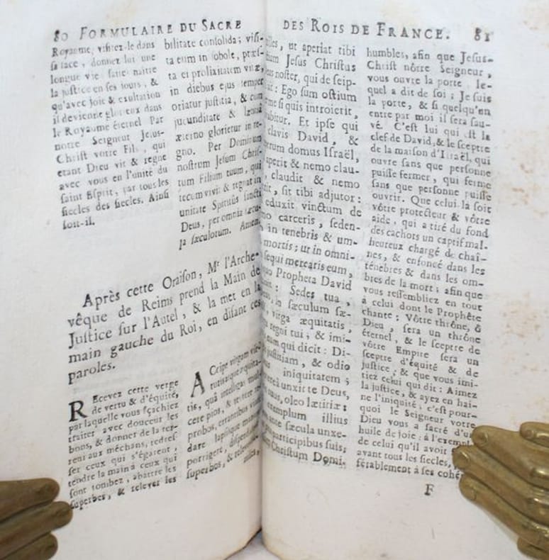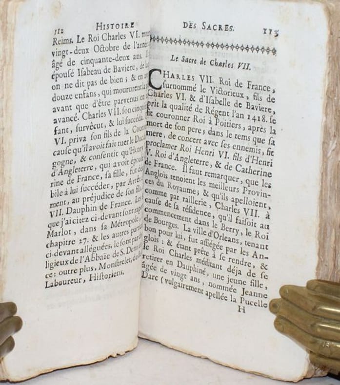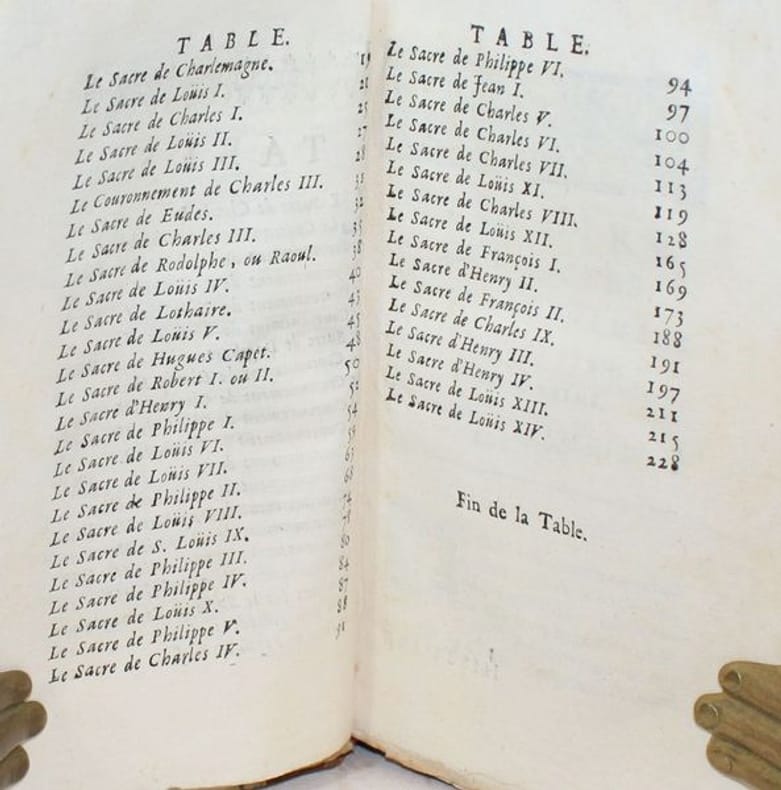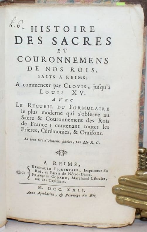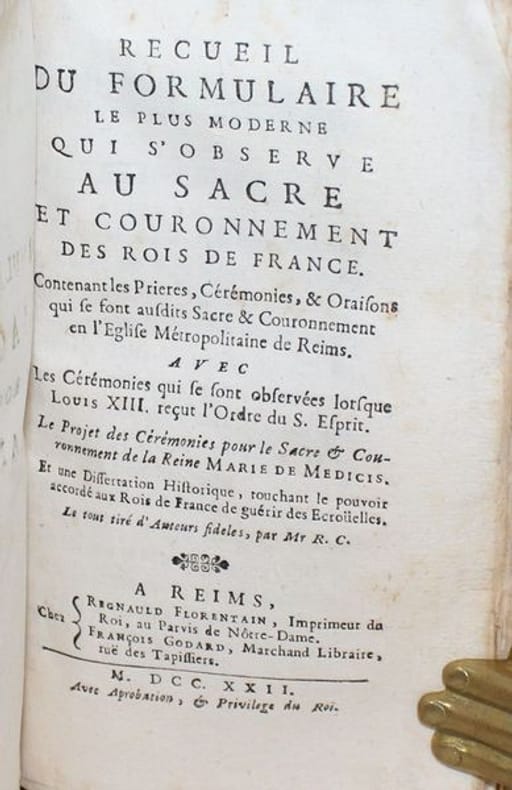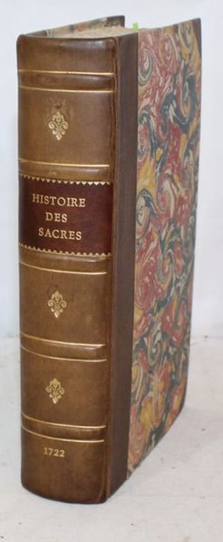 Reims, Regnauld Florentain , François Godard, 1722. Un volume grand in-12 de : un faux-titre, titre, préface, approbation et privilège, table, 243 pages, suivi du Formulaire avec faux-titre, titre où se trouvent énoncées les parties additionnelles, paginées séparément et 118 pp., suivi de 9 pp. (cérémonies..lorsque le roi Louis XIII reçut l'Ordre du Saint-Esprit, suivi de 30 pp.(projet de cérémonies pour le sacre... de la reine Marie de Médicis, suivi de 17 pp. (dissertation historique, Touchant le pouvoir accordé aux Rois de France de guérir les Ecroüelles. Edition originale. Exemplaire non émargé; quelques piqüres sur une dizaine de pages en milieu d'ouvrage, sinon bon état. Demi-basane moderne fauve, à coins, dos à nerfs orné de filets et fleurons dorés, pièce de titre brune. Très bon état.