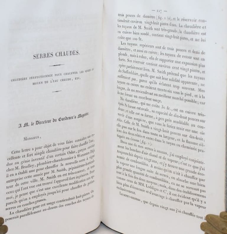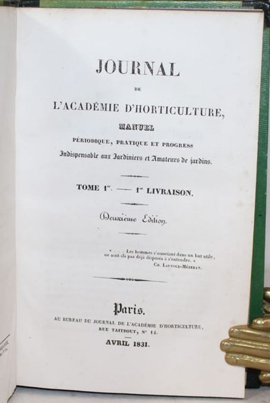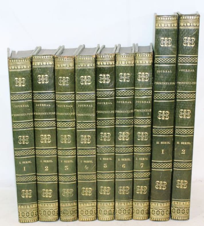 Paris, Bureau du journal de l'Académie d'horticulture, 1831 - 1834. Collection de 9 volumes composée comme suit : 7 volumes au format in-8 de 320 pages chacun, complets de leurs 9 planches et illustrations in-texte et couvrant la période d'avril 1831 à avril 1833. Suivis de deux volumes grands in-8 de 383 pages chacun avec 2 planches au premier volume et couvrant la période de aout 1833 à aout 1834. Edition originale. Très bon état intérieur malgré des rousseurs à deux volumes et sur certaines planches. Très agréables reliures homogènes en demi-veau vert foncé à coins, roulette dorée sur les plats, dos lisse très orné de filets, larges roulettes et fleurons dorés. Papier des plats d'un joli vert plus clair, et tranches bleutées. Très bon état pour cette attractive collection.