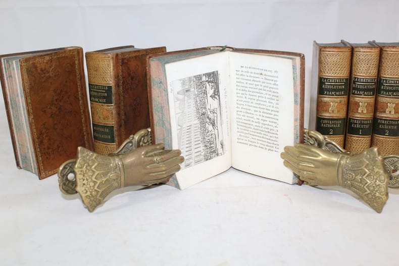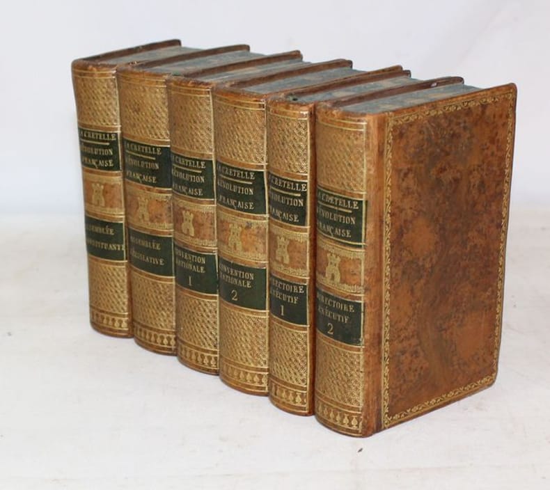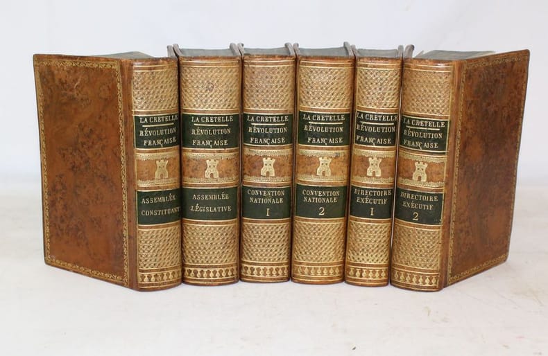 Charles de Lacretelle (1766-1855) est considéré comme l’un des pionniers de l’étude historique de la Révolution française. Vol. I : Assemblée constituante, suivie de Réflexions politiques sur les circonstances, par J. P. Rabaut. Les six gravures d’après les dessins de Moreau (sixiéme édition, Paris,1813) - Vol. II : Assemblée législative (quatrième édition, Paris, 1815) - Vol. III & IV : Convention Nationale (Paris, 1803) - Vol. V & VI : Directoire exécutif (seconde édition, Paris, 1810). Bon état d’occasion