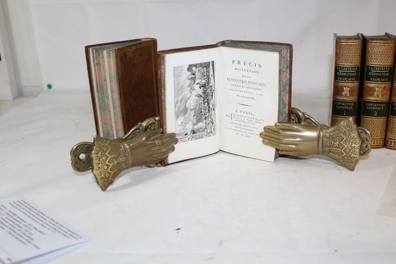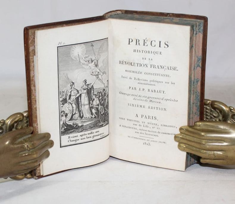 Le premier volume est l'ouvrage de Rabaut , un député à lAssemblée Constituante et à la Convention, guillotiné en 1793 après la chute des Girondins. Il parut également la même année sous le titre dAlmanach historique de la Révolution Française. Hoeffer dit à son propos : « On a rarement donné une idée plus vraie, plus nette, plus complète de cette première époque de la Révolution » (Biographie générale, tome 41, 383). La suite est écrite par Lacretelle. «Ce Précis fait suite à l'Almanach de la Révolution de Rabaut de Saint-Etienne. Il est bien écrit et assez impartial ; mais après avoir eu beaucoup de succès, il s'est vu effacé par d'autres ouvrages qui ne le valent peut-être pas.» (Brunet, III, 731.) Volume I : Assemblée constituante. (1813, 6ème édition, 6 pl.) Volumes II : Assemblée législative. (1801 EO, 2 pl.) Volumes III & IV : Convention nationale. (1803 EO, 4 pl.) Volumes V & VI : Directoire excécutif. (1810 2ème édition, 4 pl.) Provenance : De la bibliothèque de l'historien militaire Gabriel Cottreau avec son Ex-libris gravé et la devise : « Onward and upward ». Bel ensemble complet en reliure uniforme.