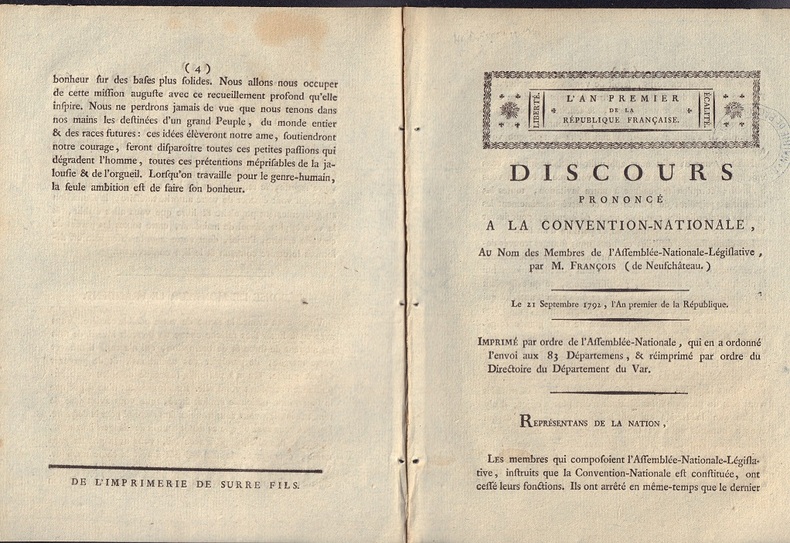 du Directoire du Département du Var. De l'Imprimerie de Surre Fils. (1792). Petit in-4 de 4 pages, bandeau de l'an premier de la République, cachet bleu de Mairie peu lisible, rousseurs marginales, mais bon état.