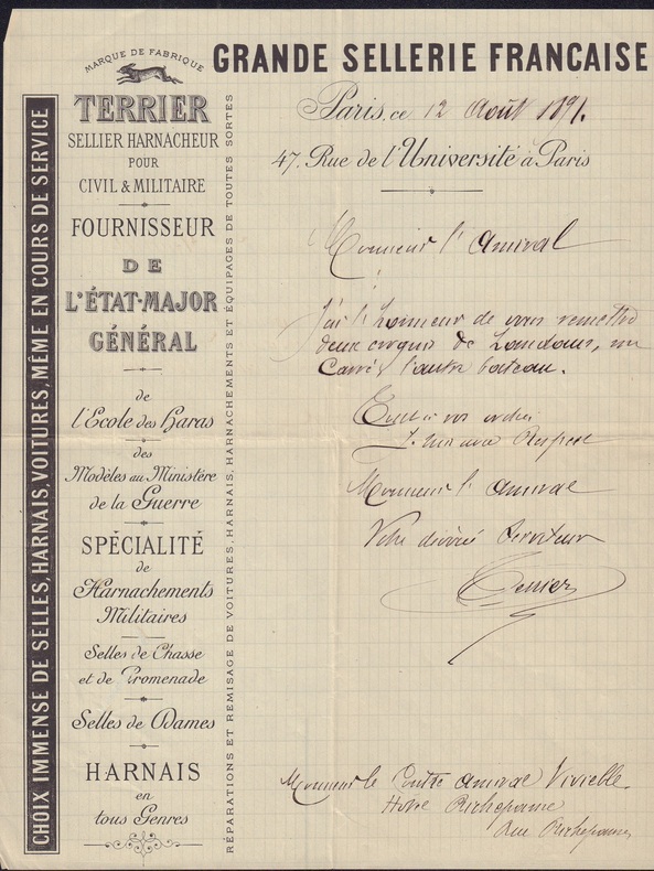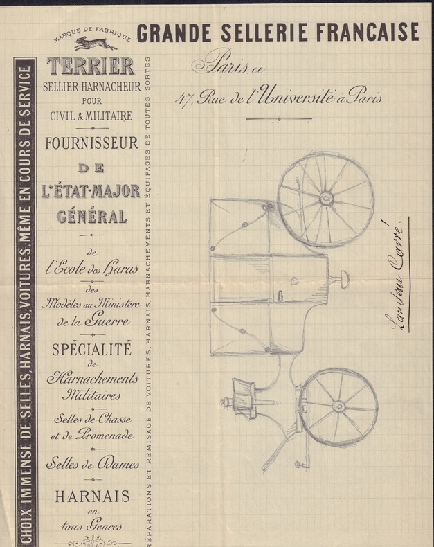 Datée de Paris. 12 août 1891. Ensemble de 3 feuilles à en-tête, soit 1. la L.A.S. 2. le croquis du landau carré. 3. le croquis du landau bateau. Documents en très bon état. On joint l'enveloppe d'expédition un peu déchirée sans perte.
