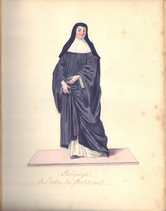 S.l.n.d. (1833). In-4 (217 x 255 mm) dos chagrin violet brun à 5 nerfs, titre doré, plats marbrés, gardes peignées, cachet d'Eugène Villeroy sur une page blanche, planches montées sur onglets, quelques rousseurs claires souvent marginales mais planches très fraîches pour la plupart. Le socle de la planche 75 Religieuse pénitente de Paris avant la Réforme est signé F. de Bergeret 1833. Sans doute l'auteur de ces gouaches.