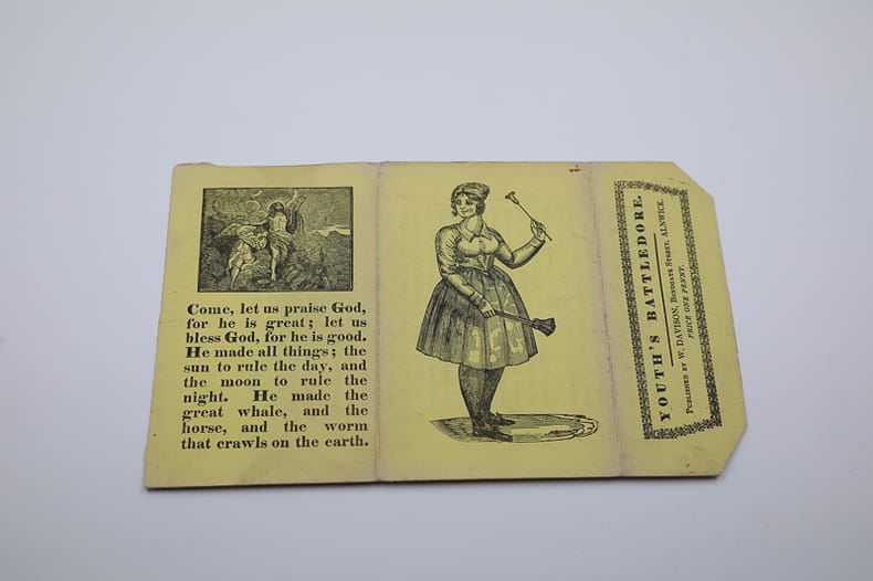 W. Davison, Bondgate Street, Alnwick Planche 1830 "Publication peu commune, et difficile à trouver compte tenu de son caractère éphémere. Youth's Battledore.Published by W. Davison, Bondgate Street, Alnwick [Angleterre, vers 1830]. Planche de papier fort (13,2x21,2 cm) pliable en trois et formant une enveloppe, recto de papier jaune illustré de bois gravés et imprimé, verso blanc illustré et imprimé. Un des premiers types d'ouvrages scolaires pour enfants. Successeurs des ""Horn Books"" (planches de bois à poignée sur laquelle était appliquée la page de leçon sous une feuille de corne transparente), et plus facile de maniement, ils furent inventés au milieu du XVIIIe siècle par Benjamin Collins. La face extérieure du Battledore comprend un grand bois gravé figurant une jeune fille jouant, une vignette illustrant la prière habituelle et le titre dans un encadrement orné sur le rabat. A l'intérieur sont imprimés 3 séries d'alphabets, 2 séries de syllabes, un bois gravé à mi-page figurant la Samaritaine et 4 ornements de texte. (Gumuchian, 81. B.Folmsbee ""A Little History of the Horn-Book"" 35-40). Livraison a domicile (La Poste) ou en Mondial Relay sur simple demande."