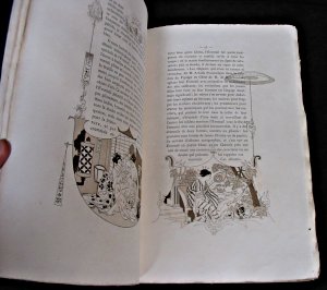 Editions originales de ces 2 ouvrages somptueusement illustrés par Paul Avril. L'éventail : Une vignette de titre bleutée, la première page dans un portique en encadrement du texte, 43 en-tête en encadrement du texte tirés en vert, rose, bleu, sépia ; culs-de-lampe, titres gravés. Texte dans un encadrement (sirènes et angelots). Page de titre en rouge et noir. L'ombrelle : Une vignette de titre, 54 illustrations en encadrement du texte, tirés en vert, rose, bleu, sépia ; culs-de-lampe et titres gravés. texte dans un encadrement. Les deux ouvrages auraient été tirés à 750 exemplaires sur vélin teinté, après le tirage de tête sur Japon. Couvertures illustrées sur japon conservées. Reliures en demi maroquin rouge à coins mosaïquées de petites feuilles vertes sur le dos. Dos à nerfs orné de roses, fleurs et feuillages. Double filet de séparation sur les plats et coins. Légères traces de frottement. Le volume de L'éventail avec rousseurs sur les couvertures. 6 feuillets dans L'ombrelle avec des brunissures. Beaux exemplaires. Très bel illustré, doué d'une certaine préciosité s'accordant au sujet, fruit d'une étroite collaboration entre l'artiste et l'écrivain. Le livre constituant une monographie intéressante sur un sujet peu étudié dans un style ironique propre à l'auteur. - Photographies et détails sur www.Edition-Originale.com -
