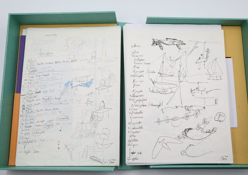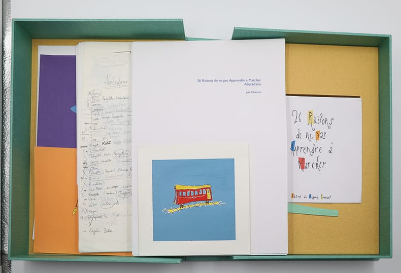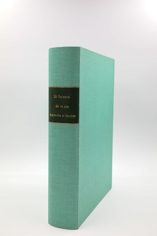 Éditions du Pingouin Souriant Feuilles sous chemise et emboitage 2003 ENSEMBLE UNIQUE. 26 Raisons de ne pas Apprendre à Marcher. Abécédaire. Par Obéron. [Accompagné des dessins originaux]. Éditions du Pingouin Souriant. Sans lieu. 2003. (25,2 x 25,2 cm). (2) ff. blancs, (27) ff., (1) f. de mention de l’auteur : couvertures de papier appliquées sur un fort bristol, titre en couleurs sur le premier plat, une paire de pieds, sur une image appliquée, en bas du second. Accompagné de : (100) ff., environ, de dessins originaux, à l’encre et au crayon, sous chemise, rangés dans un emboîtage de protection de toile vert clair portant une pièce de titre de maroquin vert lierre sur le dos. Abécédaire d’artiste réalisé par Olivier Bron, alors étudiant à l’École Estienne. Accompagné de tous les originaux et de son travail de recherche. Né en 1982, après l’École Estienne, il poursuivra sa formation à l’École Supérieure des Arts décoratifs de Strasbourg. Abécédaire et catalogue de moyens de locomotion, une lettre par double page cartonnée, le nom, à gauche, calligraphié avec son initiale sur un pavé de couleur et, en regard, l’engin en couleurs d’après ses dessins à l’encre. Finesse du trait, Avion, Hélicoptère, O.V.N.I. ont des pattes de libellule. Sont joints : l’ensemble complet des dessins originaux, en noir à l’encre, sur un carré de papier fort (25 x 25 cm au même format que les pages de l’ouvrage), un original non employé dans l’ouvrage définitif, les originaux de la typographie (couvertures et pages), cinq gouaches (essais de couleur directe) et plus de quarante feuilles de croquis (la plupart au format A4) montrant ses recherches jusqu’à l’abécédaire final, tous les dessins sont datés et signés par l’artiste. Unique et parfaitement conservé. Livraison a domicile (La Poste) ou en Mondial Relay sur simple demande.