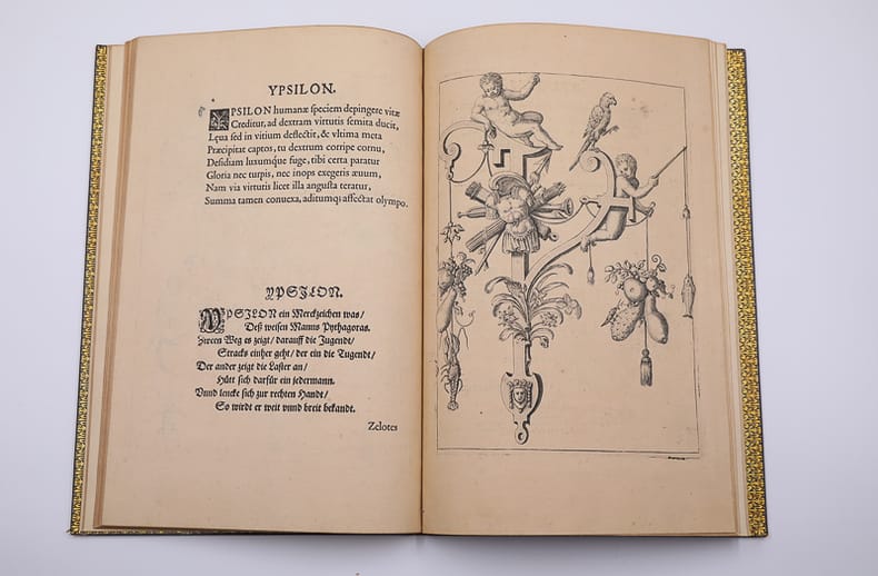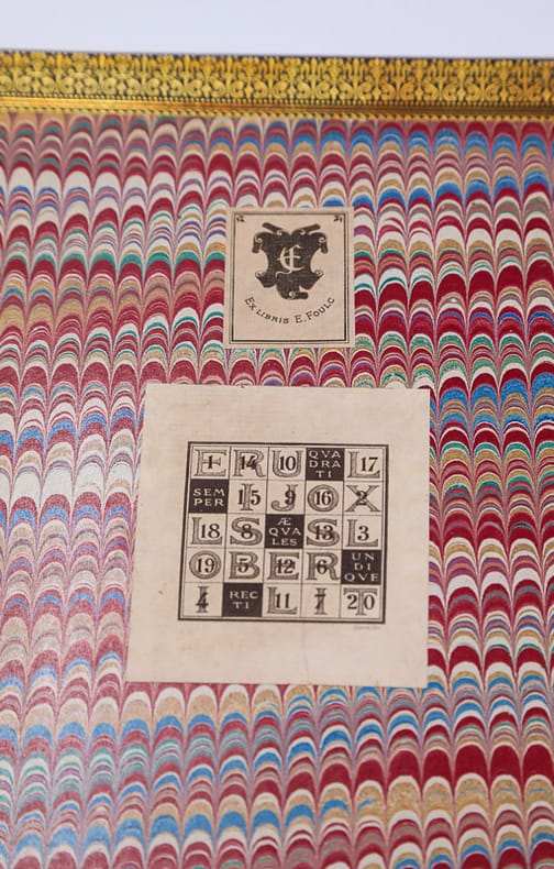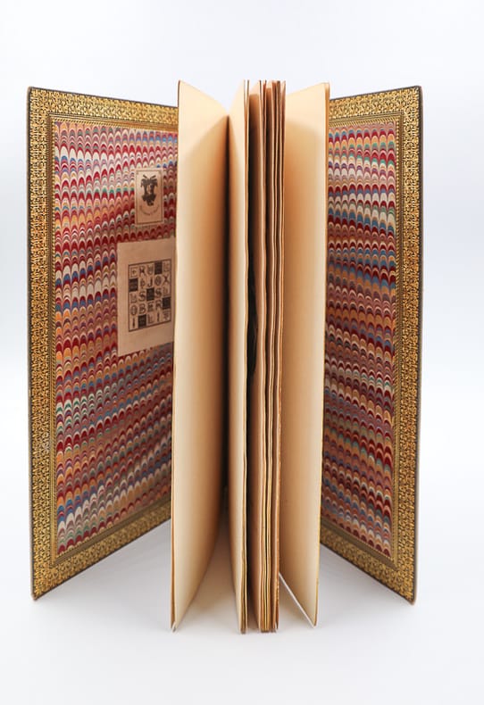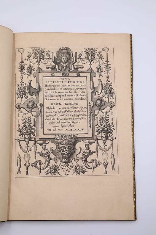 Fr. ad Moe Relié 1595 EDITION ORIGINALE DES PLUS RECHERCHEES. Nova alphati effictio historiis ad singulas literas correspondentibus, et toreumate Bryanæo artificiose in æs incisis illustrata : Versibus insuper Latinis et Rithmis Germanicis non omnino inconditis. Nejw kunstliches Alphabet, gezirt mit schonen Figurn deren jede sich auff seinen Buchstaben acconmodirt ; artlich in kupffergestochen, durch die Bryen, Auch mit Lateineschen Versen und teutschen Reimen lustig beschrieben. Fr. ad Moe. [Francfort-sur-le-Main]. 1595. In-4 (28 x 19 cm). Titre-frontispice, (2) ff. [Dédicace et préface], (24) planches gravées avec le texte latin et allemand imprimé sur la page en regard : plein maroquin havane janséniste, dos à six nerfs, dentelle intérieure et tranches dorées. (Trautz-Bauzonnet). Édition originale, des plus recherchées, du somptueux alphabet des frères de Bry. Jean Théodore (Strasbourg 1561-1623 Francfort), graveur, dessinateur et éditeur, travailla, en association avec son frère, Jean Israël (1565-1609), dans l’imprimerie familiale de Strasbourg fondée par leur père, Théodore de Bry (Liège 1528-1598 Francfort), dessinateur, graveur et éditeur protestant. Remarquable suite de vingt-quatre planches, finement gravées sur cuivre, figurant vingt-quatre lettres richement ornées inspirées de la Bible : Adam, Caïn, David, Goliath, Holopherne, Judith, Luc, Moïse, Noé, Pierre, Roboam, Salomon, Thomas, Vrias, Xhristus, etc. Les personnages représentant l’occurrence sont agrémentés de fruits, animaux, objets et angelots. En regard, le texte en latin et allemand avec lettrines ornées. Seconde émission avec le texte en allemand. Merveilleux recueil et bel exemplaire dans une élégante reliure en plein maroquin de Trautz-Bauzonnet, conçue vers 1860, avec quelques très minimes frottements d’usage. Provenances : Bibliothèque d’Edmond Foulc (1826-1916), avec son ex-libris, remarquable collectionneur d’art et de recueils d’estampes d’architecture et d’ornements. Un second ex-libris, sous forme de carré magique, révèle le nom de Jules Riollot, ingénieur spécialiste de l’étude de ces carrés. Livraison a domicile (La Poste) ou en Mondial Relay sur simple demande.