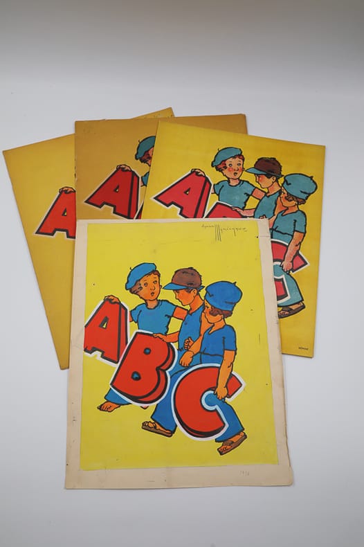 Feuilles sous chemise MAQUETTE ET TROIS ETATS DE L'ALBUM. [France, 1938]. (33x25,5 cm) sur papier fort, gouache et encre de Chine, deux jeune garçons et une jeune fille habillés de bleu, sur fond jaune, tenant chacun une lettre rouge. [Sont joints trois albums portant cette couverture (30x24 cm), (12) pp., (16) pp. et (16) pp.]. Maquette originale à la gouache et à l'encre de Chine par l'illustrateur Gaston Maréchaux (actif 1907-1942). L'œuvre est signée en tête à droite au crayon par l'artiste. Trois albums sont joints portant cette couverture : tous illustrés à l'intérieur par Jean Matet. Le premier comportant un casier alphabétique et neuf planches d'animaux dont une en noir avec un texte en regard soulignant l'image, sans initiales. Le second figurant animaux, objets avec une à quatre lettres par page illustrées de nombreuses occurrences légendées avec les initiales et un casier alphabétique en quatrième de couverture sur papier. Le troisième identique avec des couvertures cartonnées souples. Livraison a domicile (La Poste) ou en Mondial Relay sur simple demande.
