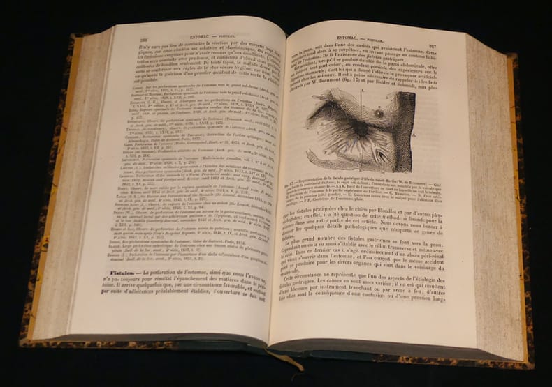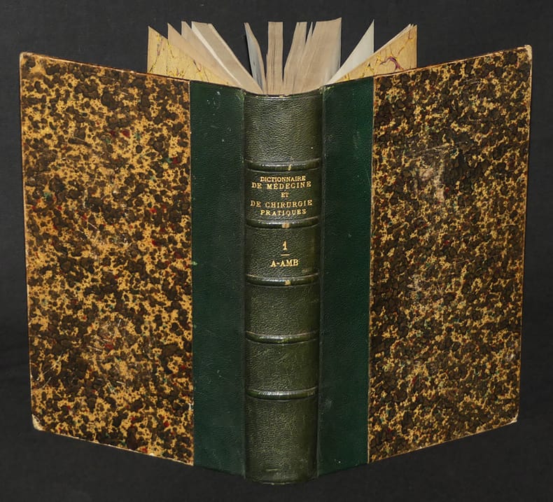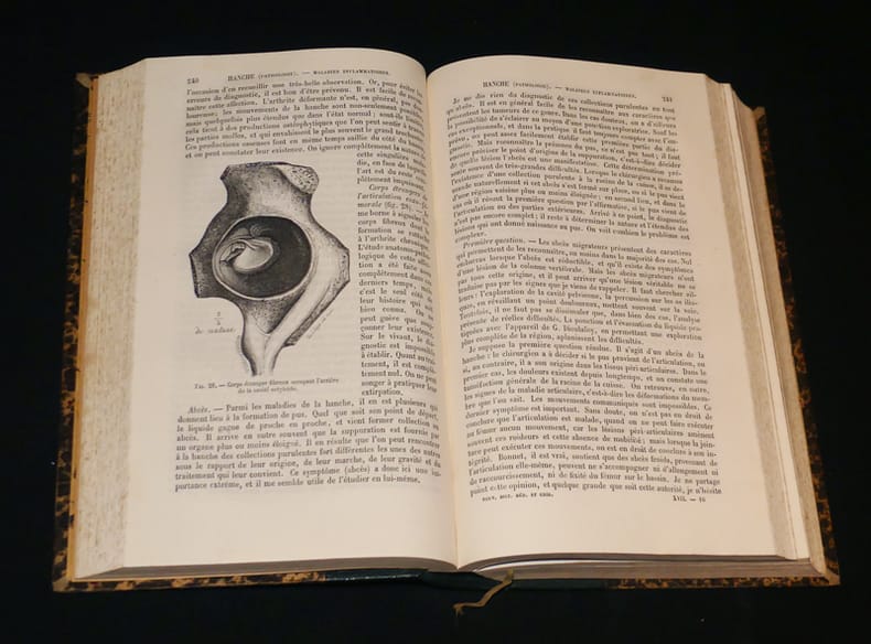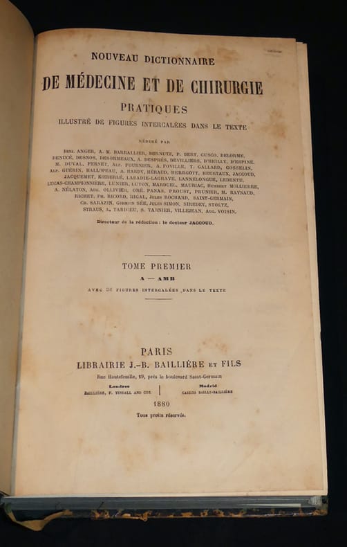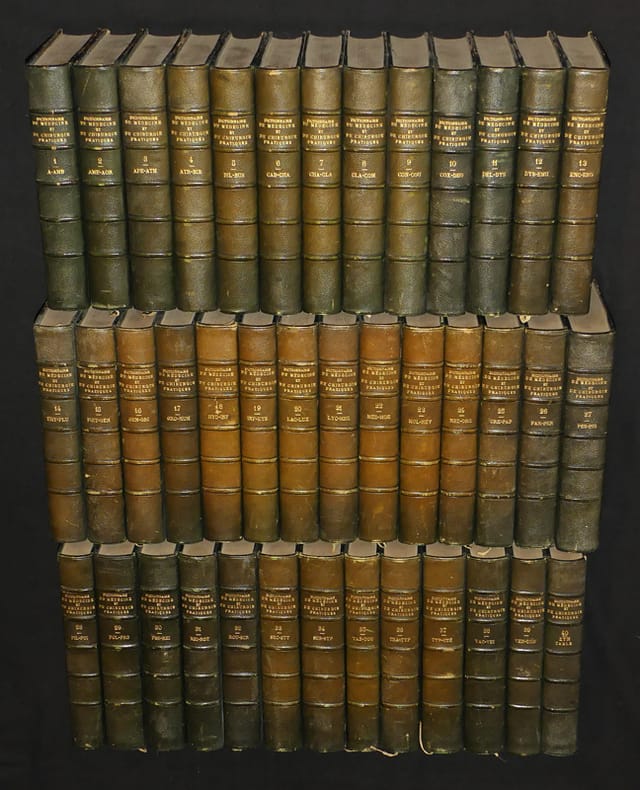 Paris, Librairie J.-B. Baillière et fils Relié 1880 40 volumes in-8 demi-chagrin vert uniforme de l'époque, nombreuses figures dans le texte. Redigé par ANGER, BARRALLIER, Paul BERT, DELORME, DESORMEAUX, DUVAL, Alfred FOURNIER, A. FOVILLEN GOSSELIN, GUERIN, HALLOPEAU, HERUTAUX, JACCOUD, LEDENTU, MARDUEL, NELATON, OLLIVIER, PROUST, RICORD, ROCHARD, SEE, Jules SIMON, TARDIEU, VOISIN, etc. dos parfois insolés par endroits, quelques marques et frottements d'usage, quelques rousseurs sans gravité, par ailleurs intérieur bien conservé, bel exemplaire. Livraison a domicile (La Poste) ou en Mondial Relay sur simple demande.