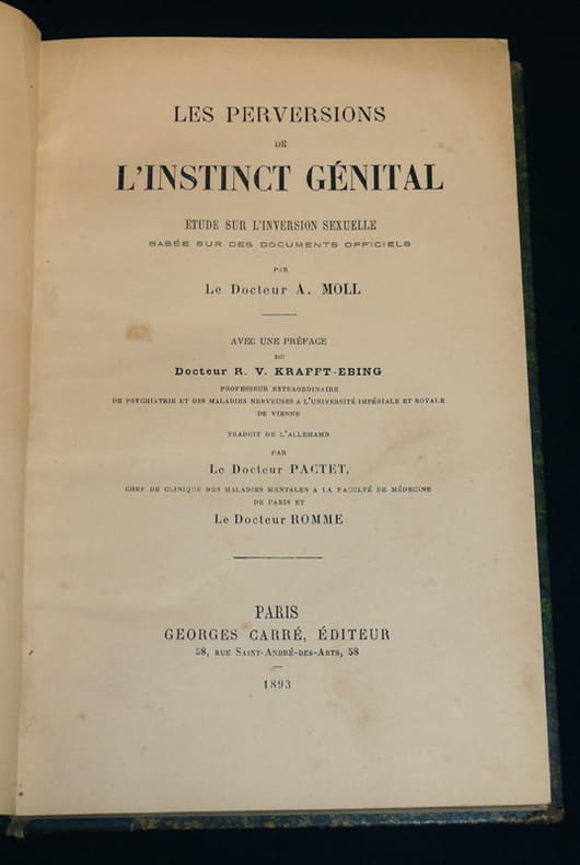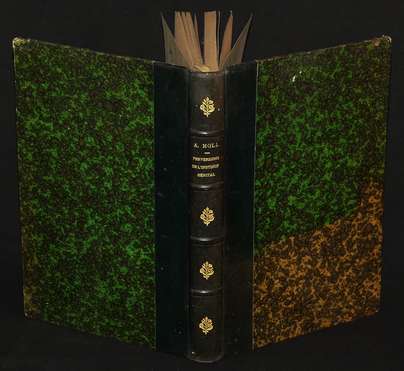 Paris, Georges Carré, 1893, in-8, (4), (2), XXXVI, 327, (2)pp, demi-toile noire de l'époque à la bradel, dos orné de filets dorés, du nom de l'auteur et du titre, couvertures conservées (accidents aux coins, coiffes usées), Troisième édition parue la même année que l'originale. L'homosexualité, ici nommée "inversion sexuelle" ou "uranisme", est analysée telle un cas d'affection mentale. Après une approche historique et sociale, Moll se propose d'établir une clinique de l'homosexualité : étiologie, étude théorique, diagnostic, thérapeutique, législation (il ne manque qu'une symptomatologie !). En tête du volume, 36 pages de plaidoirie de l'avocat Bourdillon, défendeur de l'éditeur G. Carré. Celui-ci fut poursuivi par le Ministère Public, à la demande de la "Ligue contre la licence des rues", lors de la publication du présent ouvrage, pour "outrage public aux bonnes moeurs". La couverture et les trois premières pages se détachent, dans les marges, quelques traits de crayon bleu (4), (2), XXXVI, 327, (2)pp.