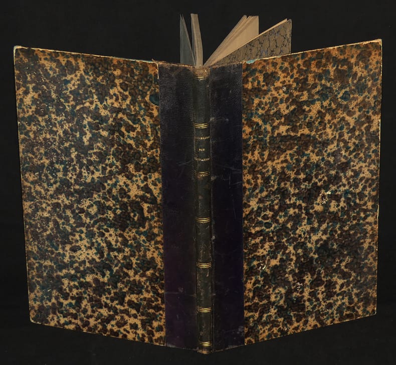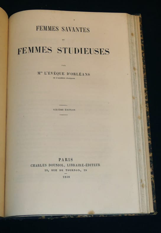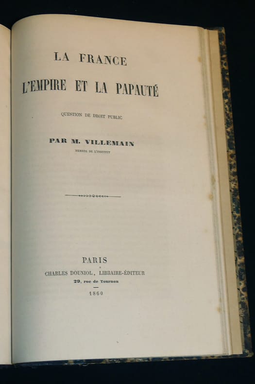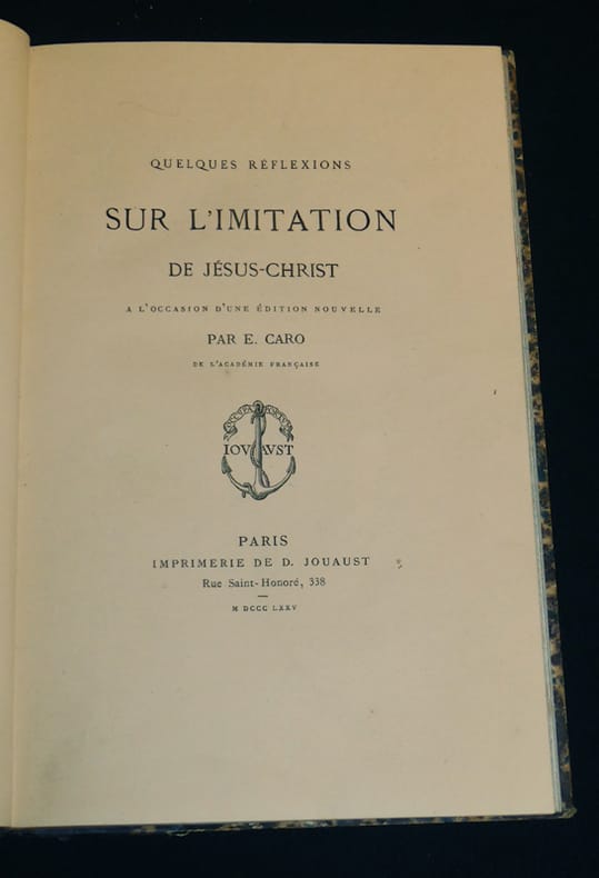 Paris, Charles Douniol, libraire-éditeur, rue de Tournon, 29 Relié "In-8 (16 x 24,7 cm), reliure demi-basane, dos lisse, envoi à peine lisible de E. Caro, ce volume réunit la préface seule de ""Quelques réflexions sur l'imitation de Jésus-Christ"" de E. Caro, publiée à part de l'ouvrage (1875, Imprimerie de D Jouaust, XXXII pages), suivi de ""Femmes savantes et femmes studieuses"" de Mgr l'évêque d'Orléans Félix Dupanloup (1868, Charles Douniol, 80 pages) et ""La France, l'Empire et la papauté"" par M. Villemain (1860, Charles Douniol, 32 pages) ; frottements sur le cuir et aux coupes, par ailleurs bon état général. Livraison a domicile (La Poste) ou en Mondial Relay sur simple demande."