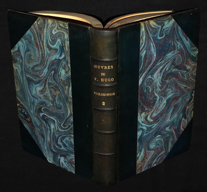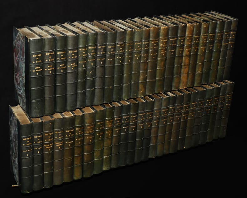 Paris, édition Hetzel-Quantin Relié 1926 "MAGNIFIQUES EDITION ILLUSTREE des Oeuvres de Victor Hugo Deuxième impression de l'édition collective et définitive, d'après les manuscrits originaux, dite « Ne varietur » (Ne varietur : édition sans possibilité de changement, donc dans ce cas définitive). Réimpression en 1926 de l'édition publiée entre 1880 et 1885 (du vivant de Hugo), où l'on a ajouté les gravures de François Flameng (ainsi que d'autres gravures notamment dans ""les misérables"" et ""Notre Dame de Paris""), absentes du premier tirage car vendues comme suite en chemise et très rarement reliées dans cette première édition. 48 volumes in-8° (Octavo) (chaque volume comporte plus ou moins 500 pages) (24 * 16 cm) relié en demi-chagrin bleu nuit à coins, têtes dorées ; 250-350 pp par volume ; 50 kg. Couvertures entièrement conservées. I. Poésie (16 volumes) II. Philosophie (2 volumes) III. Histoire (3 volumes) IV. Voyage : Le Rhin (2 volumes) V. Drame (5 volumes) VI. Romans (14 volumes) VII. Actes et paroles (4 volumes) VIII. Victor Hugo raconté (2 volumes). Le premier volume publié fut le tome 1 de ""Poésie"" il contient notamment un avertissement des éditeurs dans lequel ils ont recopiés une lettre que leur adresse Victor Hugo, il y dit "" Mes chers éditeurs, c'est aujourd'hui mon jour de naissance, vous souhaitez que se soit le jour de naissance de votre édition, où doit tenir mon oeuvre tout entière ; je vous remercie et je vous obéis. Voici, pour vous aider dans votre utile travail, tous mes manuscrits ; faites en l'usage que vous voudrez... Paris, 1880."" Elle est suivi d'une petite préface de Victor Hugo. On note dans ce volume que les éditeurs on pris le soin d'y inclure les préfaces des différentes éditions des différentes oeuvres et cela dans tous les volumes que cela soit pour les romans, les poésies et les autres ouvrages. L'ensemble comporte quelques portraits de Victor Hugo, des gravures illustrant les oeuvres. La premiére page de titre nous indique que l'ouvrage est illustré de gravures à l'eau-forte d'après les dessins de François Flameng, ce qui est le cas de toute la série. La série est bien complète des cent magnifiques dessins de Flameng magnifiquement gravés. Notre exemplaire comporte en plus de celles-ci 50 autres gravures. Exemplaire attentivement collationné ; de rares rousseurs dans certains volumes, papier légèrement jauni, très bon état. Livraison a domicile (La Poste) ou en Mondial Relay sur simple demande."