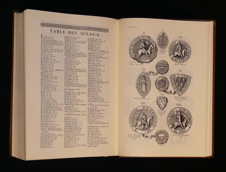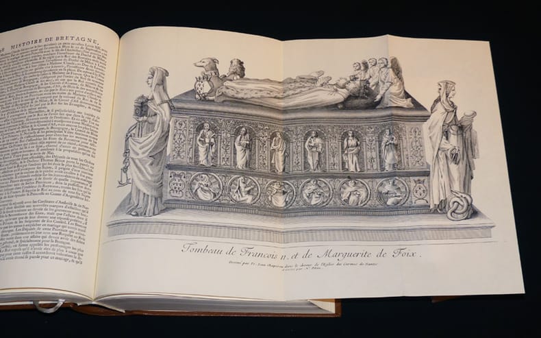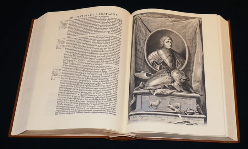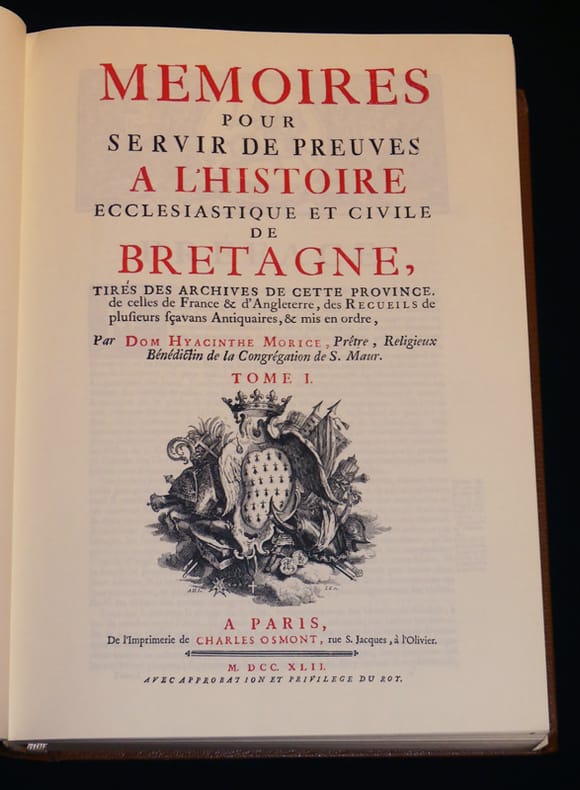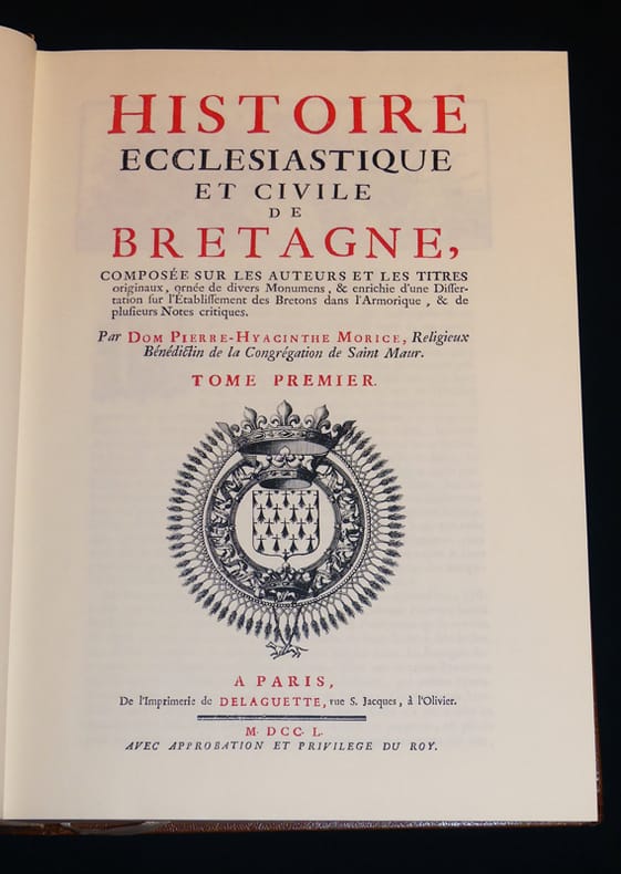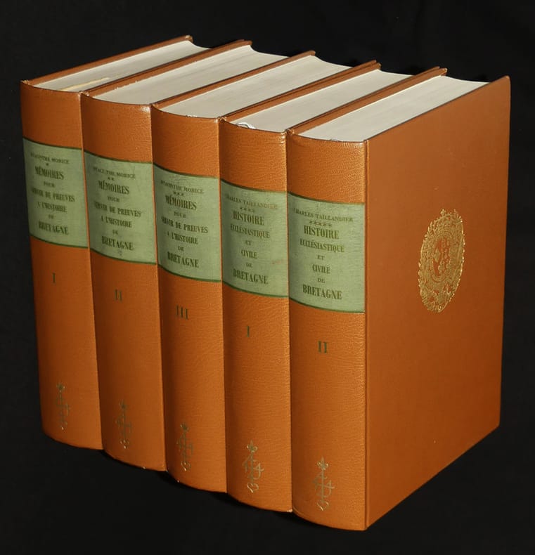 Editions des 4 seigneurs Cartonné 1974 "Cinq volumes in-4 (20 x 27,7 cm), cartonnés, aspect simili cuir, médaillon doré aux premiers plats, cet exemplaire en fac simile comprend : ""Mémoires pour servir à l'Histoire ecclésiastique et civile de Bretagne"" par Dom Hyacinthe Morice (en 3 tomes de 1708, 1840 et 1800 pages, avec planches en noir et blanc en fin des tomes 1 et 2), et ""Histoire ecclésiastique et civile de Bretagne"" par Dom Pierre-Hyacinthe Morice (en 2 tomes de 1151 et 483-ccclxxxviii pages) ; quelques légers frottements aux coins et coiffes, ors passés au premier plat des tomes 2 et 3 des ""Mémoires"", par ailleurs très bon état général. Livraison a domicile (La Poste) ou en Mondial Relay sur simple demande."