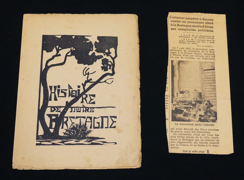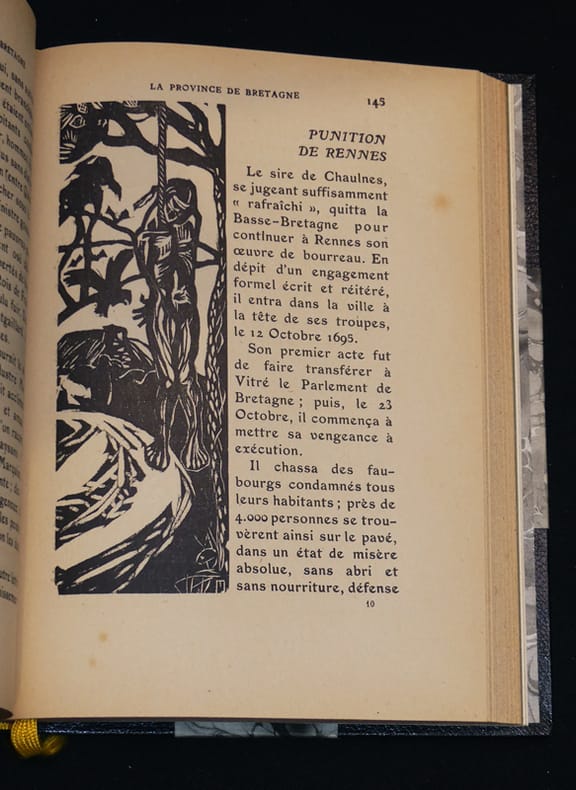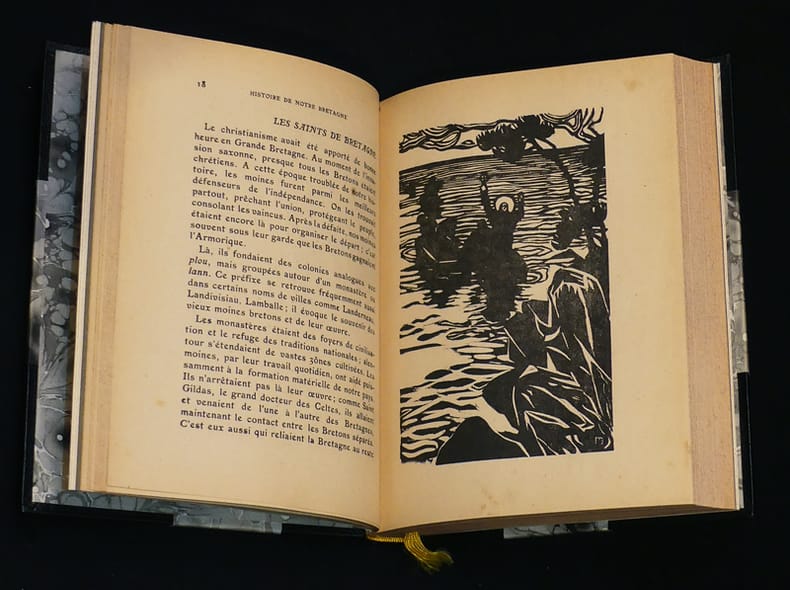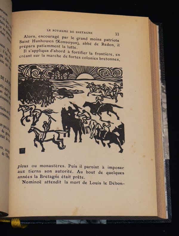 A l'enseigne de l'Hermine Broché 1922 Ouvrage très recherché pour les illustrations de Jeanne Malivel. Peu commun. Exemplaire relié demi- chagrin bleu nuit à coins, in-12 (14,5 x 19,5 cm), broché, 238 pages, ici l'un des 1000 exemplaires non numérotés (tirage total à 1050 exemplaire dont 50 sont numérotés), ouvrage décoré de gravures sur bois originales et d'une carte nouvelle de la Bretagne armoricaine par Jeanne Malivel, couverture et dos conservés. Complet du petit errata volant imprimé en rouge, ainsi que de la plaquette de présentation et du bulletin de souscription (c'est deux documents sont assez rare). Un des anciens propriétaires de ce livre a joint un article de journal concernant l'attentat perpétré à Rennes contre un monument élevé à la Bretagne. Attentat perpétré le 7 août 1932 ; reliure moderne, quelques taches sur les plats, très bel état général. Livraison a domicile (La Poste) ou en Mondial Relay sur simple demande.