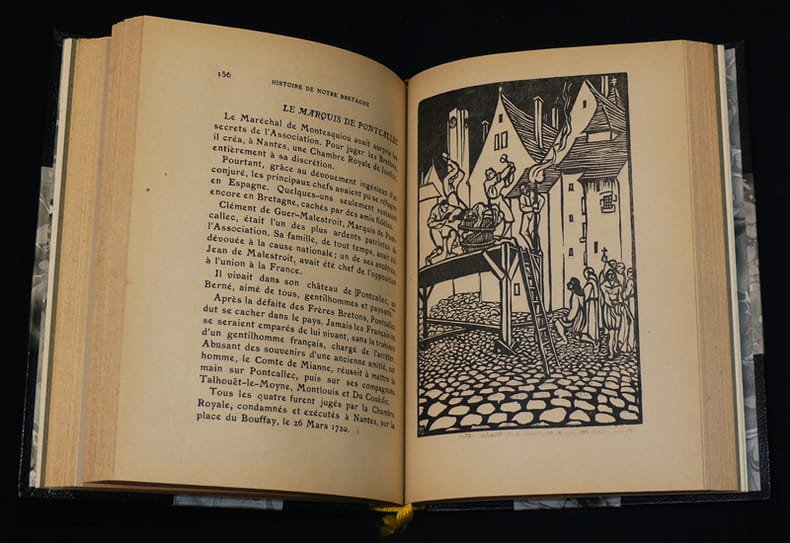 Imprimerie Oberthur, Rennes Relié 1947 In-8 (15 x 22.5 cm), relié demi-toile, couverture d'origine illustrée conservée, 119 pages, figures en noir hors-texte avec serpentes, exemplaire de luxe n°33/100 tiré sur pur fil Lafuma, notes d'histoire sur l'oeuvre Notre-Dame de Toutes-Graces et des Cadets de Bretagne recueillies et commentées par J. Laumailler ; quelques rousseurs et pliures aux plats d'origine, quelques moississures à l'intérieur, par ailleurs assez bel état. Livraison a domicile (La Poste) ou en Mondial Relay sur simple demande.