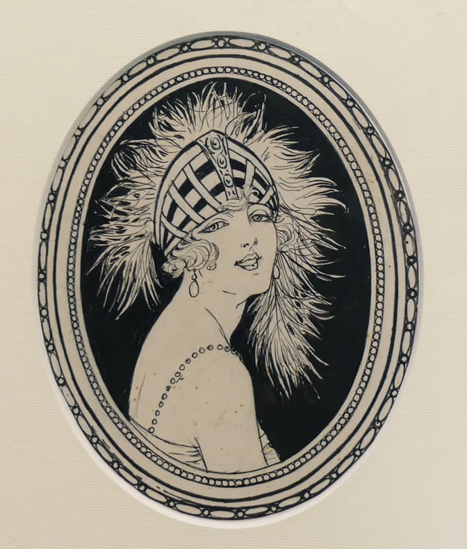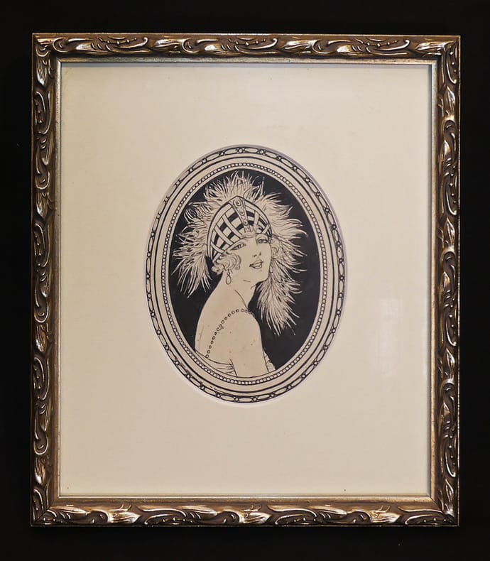 Dessin original Charmant dessin original à l'encre de Guillot, très bien exécuté et détaillé, portrait en buste d'une jeune femme au diadème dans un ovale, joli encadrement probablement plus tardif mais dans le goût art-déco également, passe partout elliptique. Le nom Guillot est indiqué au crayon au dos de l'encadrement, mais nous n'avons pas plus d'information ; bel état. Livraison a domicile (La Poste) ou en Mondial Relay sur simple demande.