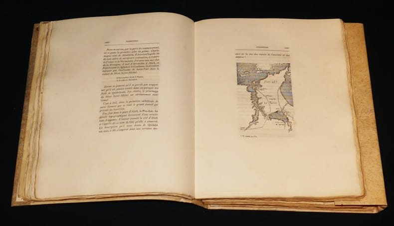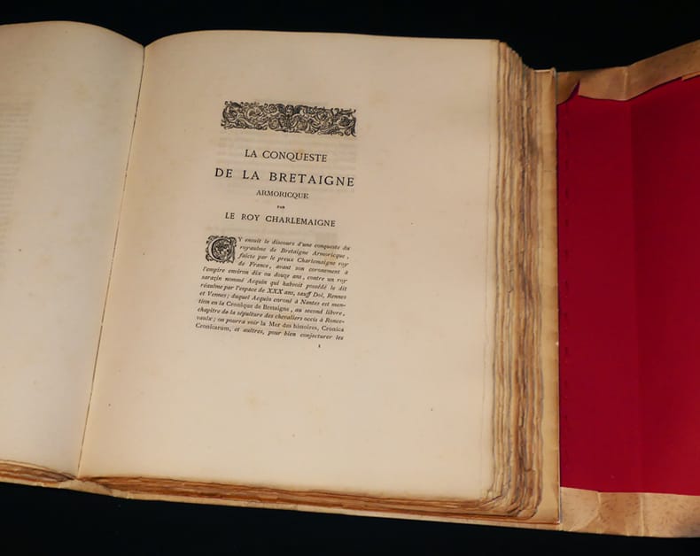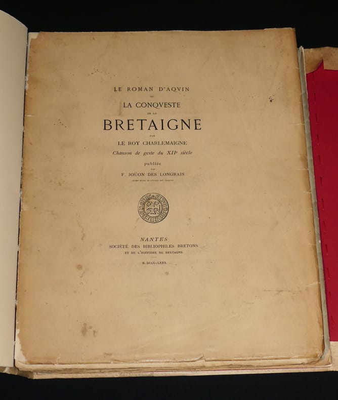 Nantes, Société des Bibliophiles Bretons et de l'Histoire de la Bretagne Reliure 1880 Exemplaire superbement relié de ce tirage limité à 400 exemplaire, ici le numéro 147 nominatif ayant appartenu à Raoul Papin de la Clergerie. Reliure souple en plein parchemin Ouvrage au format in-4° (28 * 22 cm), CXXVII pages pour la préface et le sommaire puis 239 pages pour la transcription du texte et les notes et corrections qui commence à page 123. Couverture et dos conservés. Épopée en vers, la chanson d'Aiquin ou la conquête de la Bretagne par le roi Charlemagne, évoque la présence des vikings (appelés anciennement Normands) et de leur roi Aiquin (correspondant à Incon) « de nort pays » dans la région d'Alet (Saint-Malo, Saint-Servan, Rance) ainsi que dans l'estuaire de la Loire. Elle présente ensuite les différents épisodes de la lutte de Charlemagne et de l'archevêque de Dol, Ysoré (avatar de Wicohen, historiquement attesté au Xe siècle) pour les en chasser et de leur poursuite par le duc Naimes (probablement Nominoë) à travers toute l'Armorique, soit environ trois siècles après les faits. La seule copie connu a été retrouvé dans les ruines du monastère franciscain de l'île de Cézembre près de Saint-Malo ; Livraison a domicile (La Poste) ou en Mondial Relay sur simple demande.