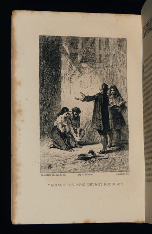 Par Daniel de Foe. Traduction de Petrus Borel. Avec huit eaux-forte par Mouilleron. Portrait gravé par Flameng (T1).Tirage à 210 exemplaires sur Grand papier. Celui-ci (N°35) un des 20 sur papier Whatman.Paris, Jouaust - Librairie des Bibliophiles - Imprimé par D. Jouaust pour la Petite Bibliothèque Artistique, 1878.T1 - Avertissement (4pp), Notice (XLVII pp) et 260 pages. T2 - 252 pp. T3 - 267 pp. T4 - 229 pp. 4 frontispices différents.Belle reliure demi chagrin vert à coins. Dos à nerfs aux titre, auteur et date en pied dorés. Tête dorée sur témoins, non rogné. Couvertures conservées. Pas de rousseur. Parfait état. Bel exemplaire, bien relié. Format in-12°(18x12).Daniel Defoe, de son vrai nom « Daniel Foe », est un aventurier, commerçant, agent politique et écrivain anglais (1660-1731). Il est notamment connu pour être l'auteur de Robinson Crusoé et de Heurs et Malheurs de la fameuse Moll Flanders.