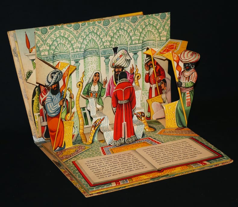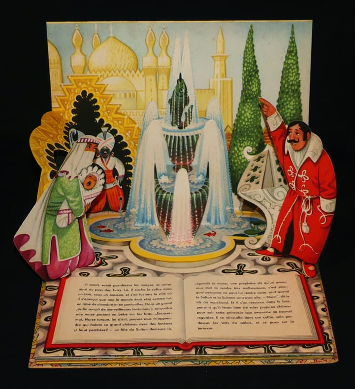 Artia / Del Duca, 1960. Pop-up in-4 à l'italienne, dos de percaline argenté. Légers frottements en bords, pour le reste en belle condition: les merveilleux systèmes sont en bon état. Outre les 8 pop-up, chaque page comporte des tirettes pleines de surprises ! Ravissant.